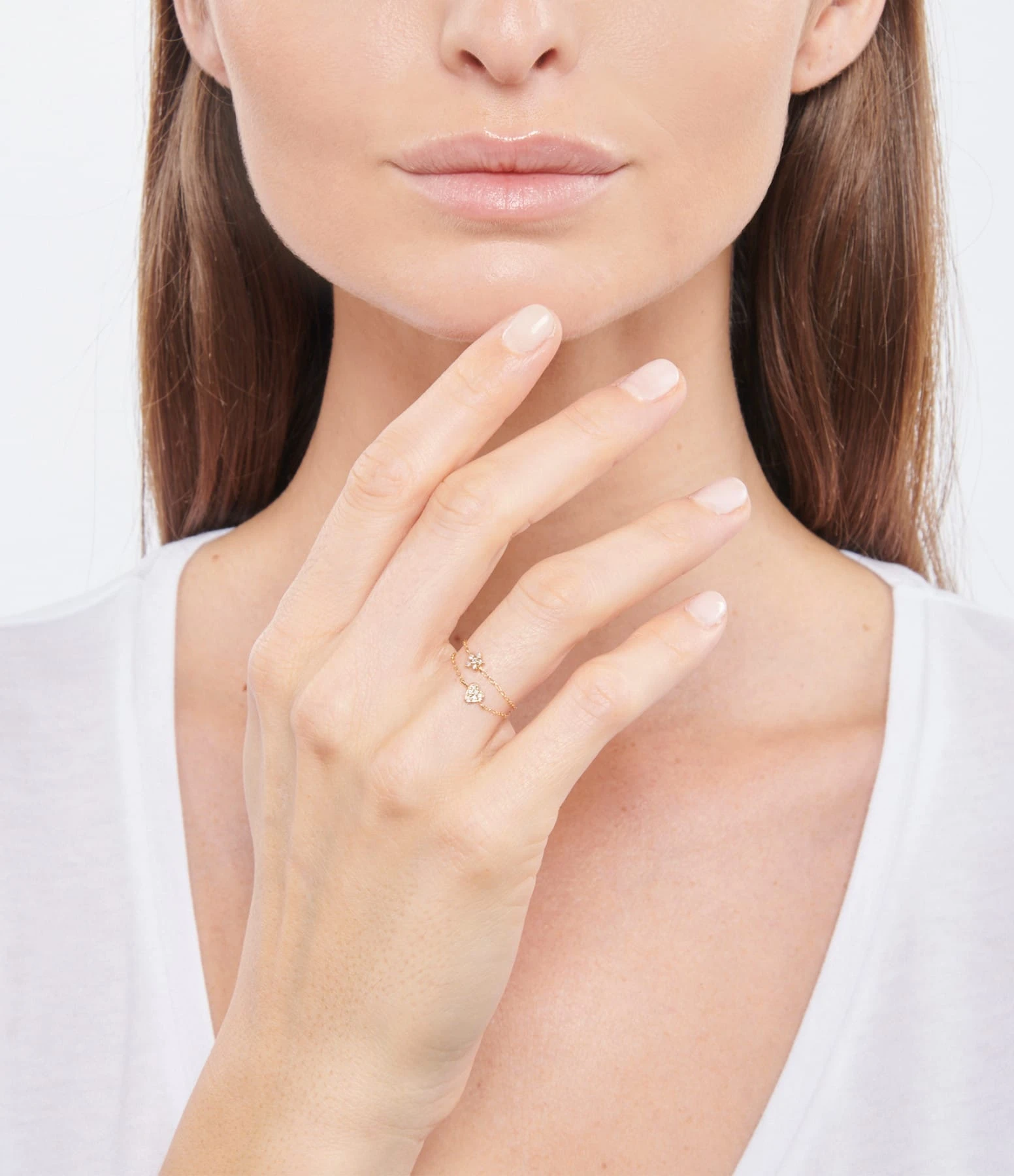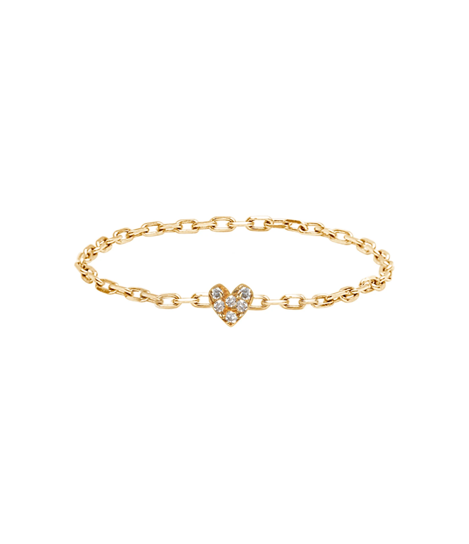 Bague souple avec chaîne en or jaune et cœur orné de diamants.