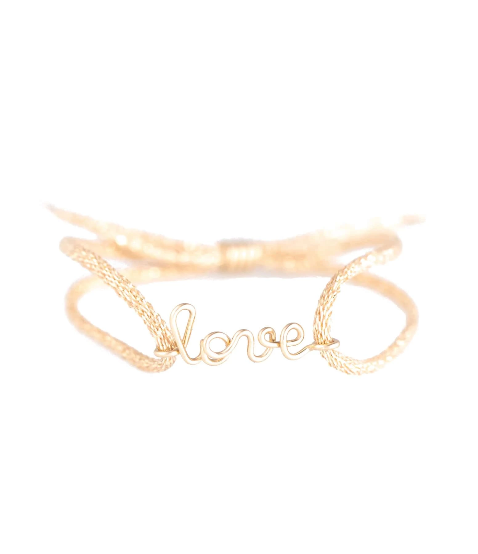 Bracelet sur cordon de soie et lurex, agrémenté d’un fil d’or gold filled formant les mots “Love”. Cordon ajustable par nœud coulissant.