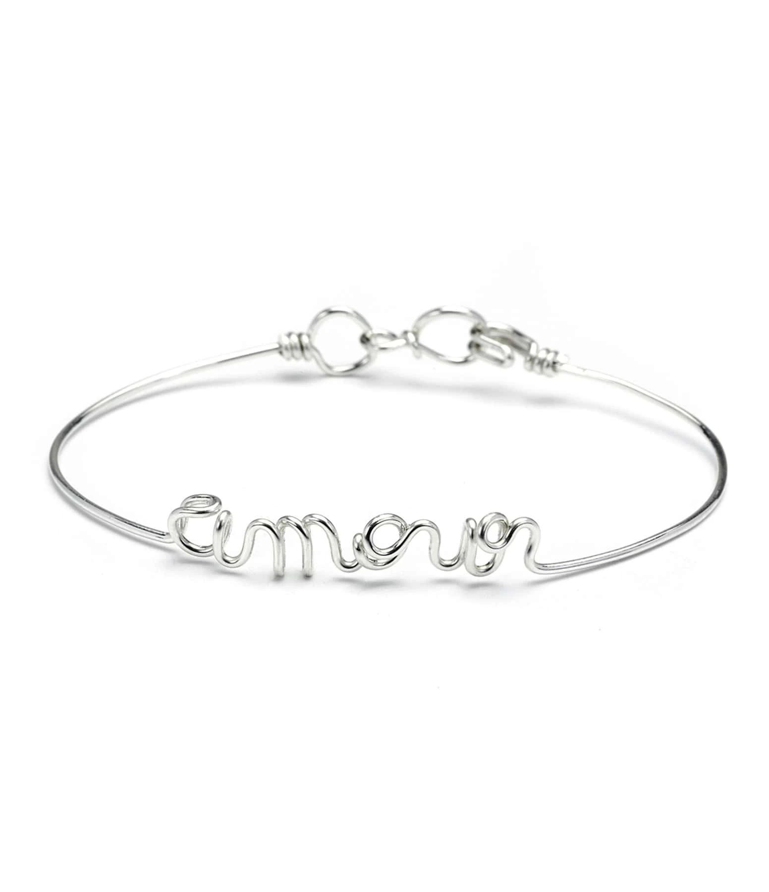 Bracelet jonc composé d’un seul et unique fil d’argent, formant le mot “Amour”. Se porte ajusté.