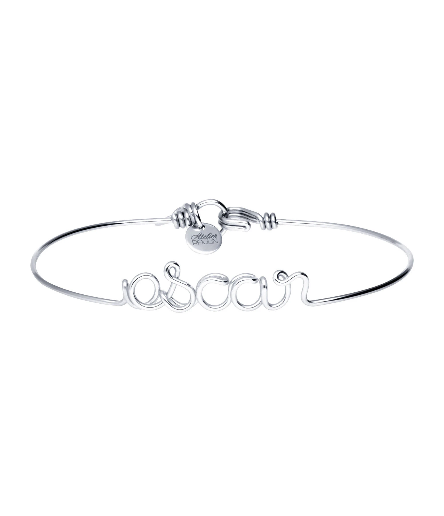 Bracelet jonc composé d’un seul et unique fil d’argent, formant le mot de votre choix. Se porte ajusté.