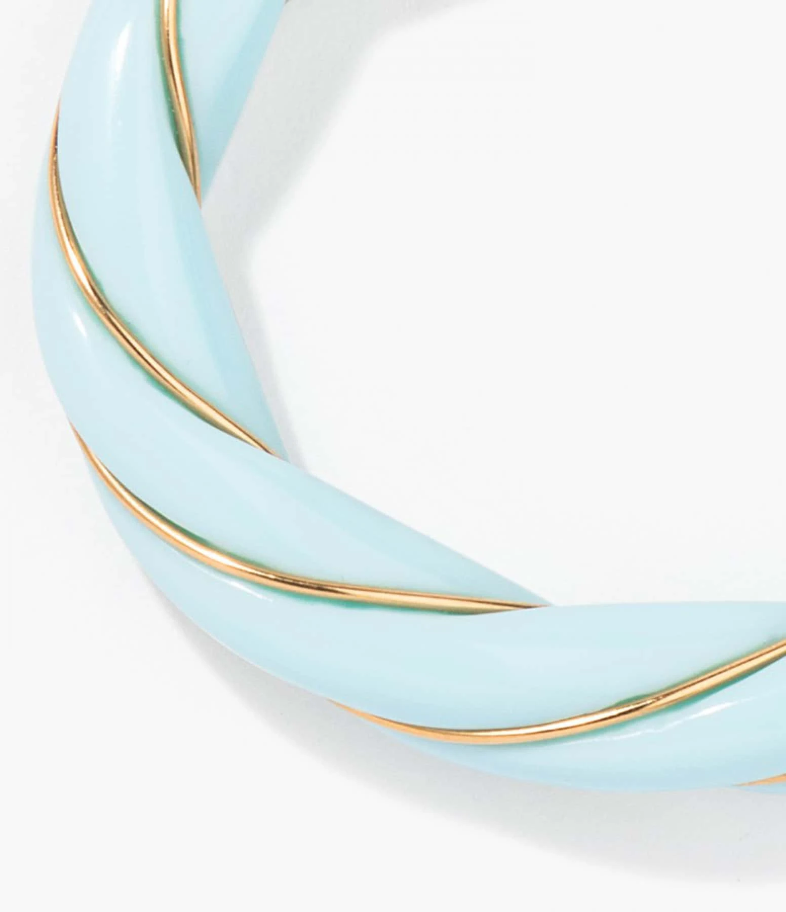 Bracelet jonc torsadé en bakélite bleu bébé, parcouru d’un fil doré. Jonc rigide, non réglable.
