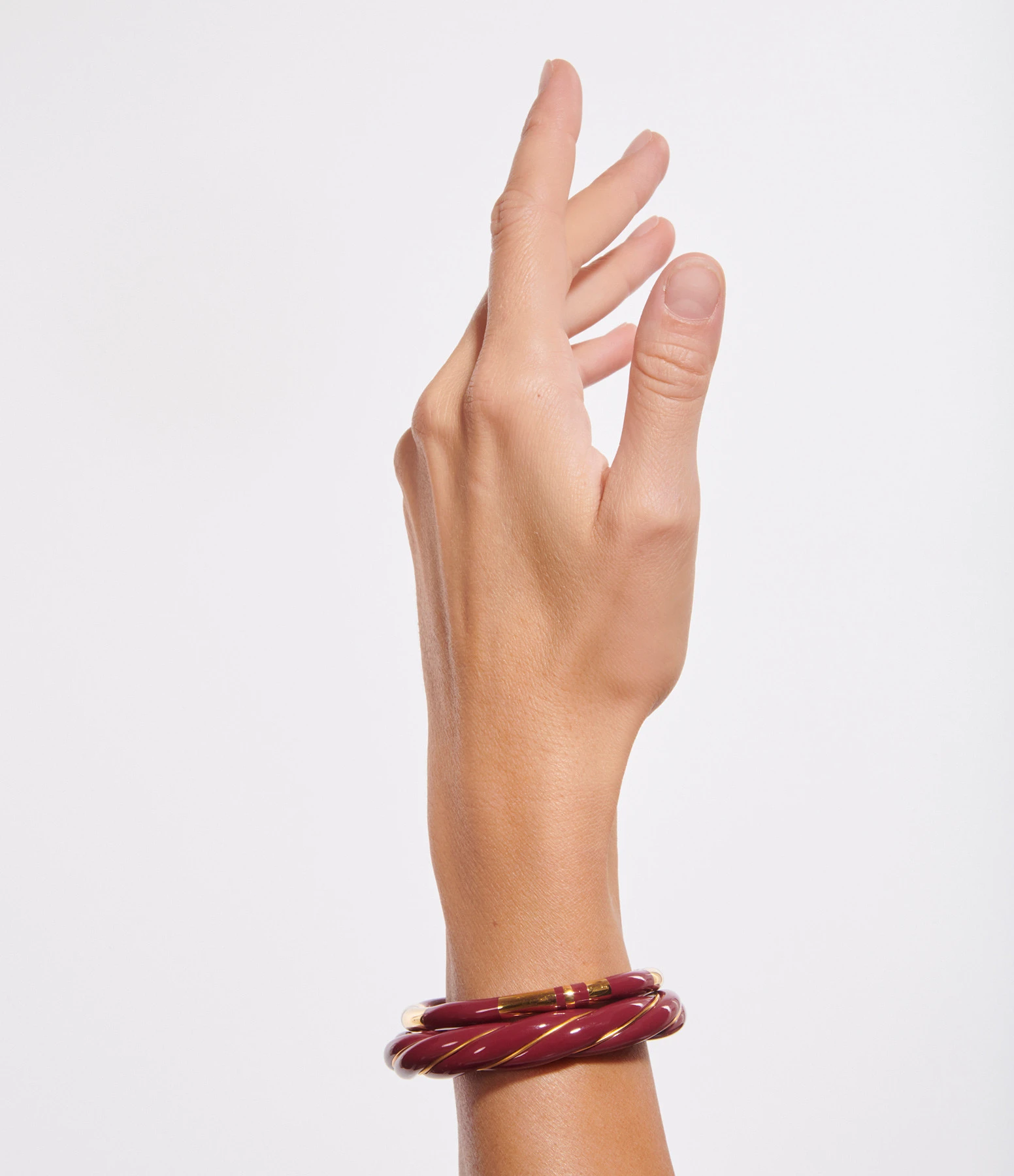 Bracelet jonc torsadé en bakélite bordeaux, parcouru d’un fil doré. Jonc rigide, non réglable.