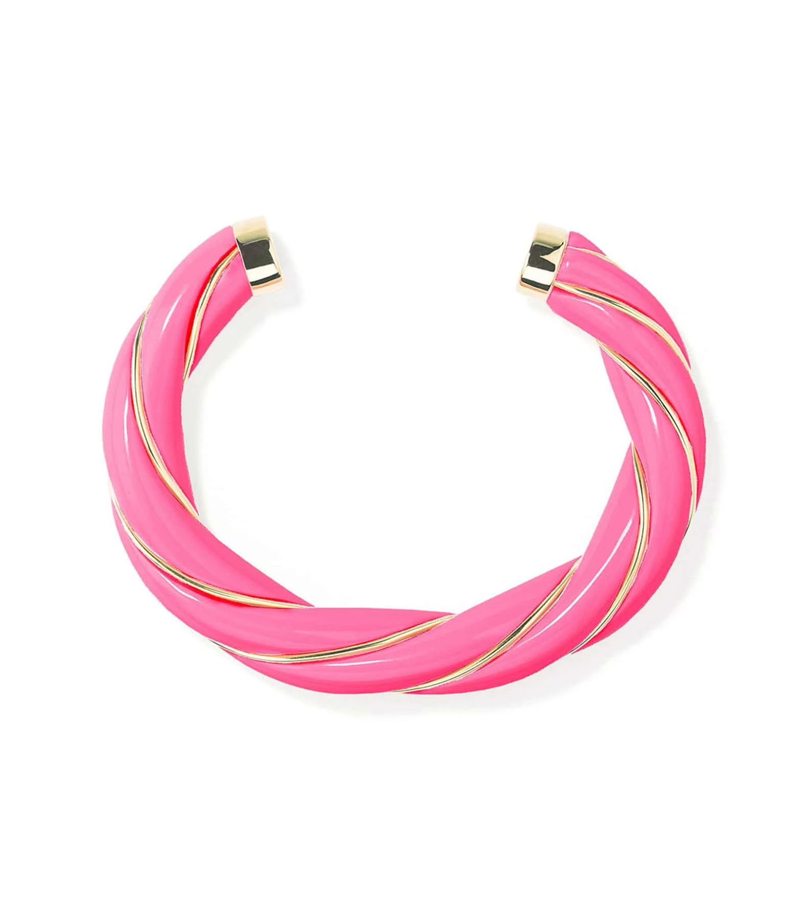 Bracelet jonc torsadé en bakélite rose, parcouru d’un fil doré. Jonc rigide, non réglable.