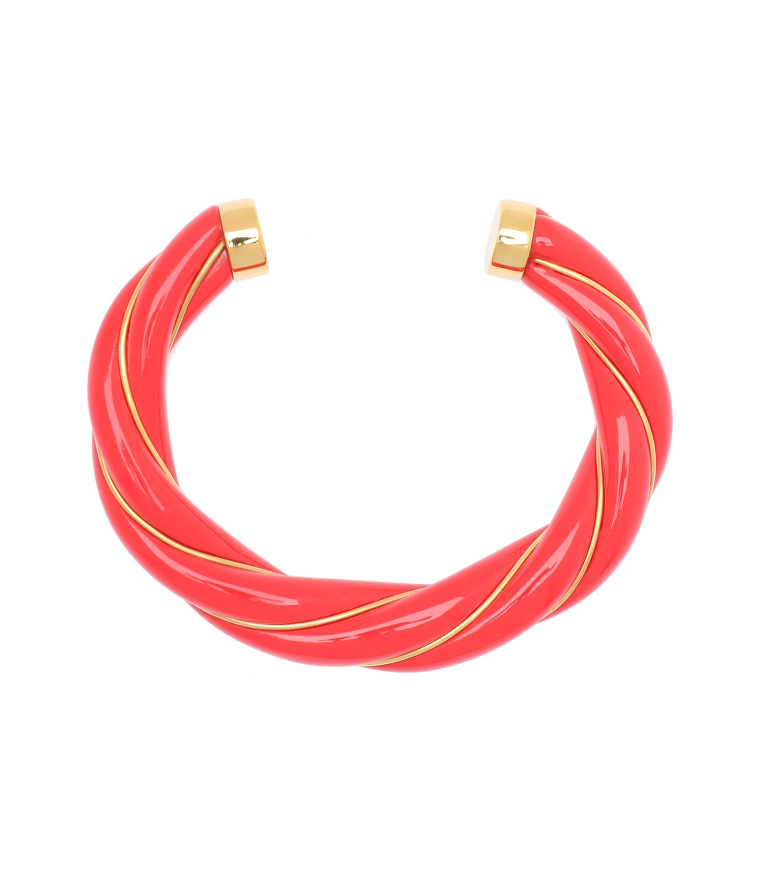 Bracelet jonc torsadé en bakélite rouge vermillon, parcouru d’un fil doré. Jonc rigide, non réglable.