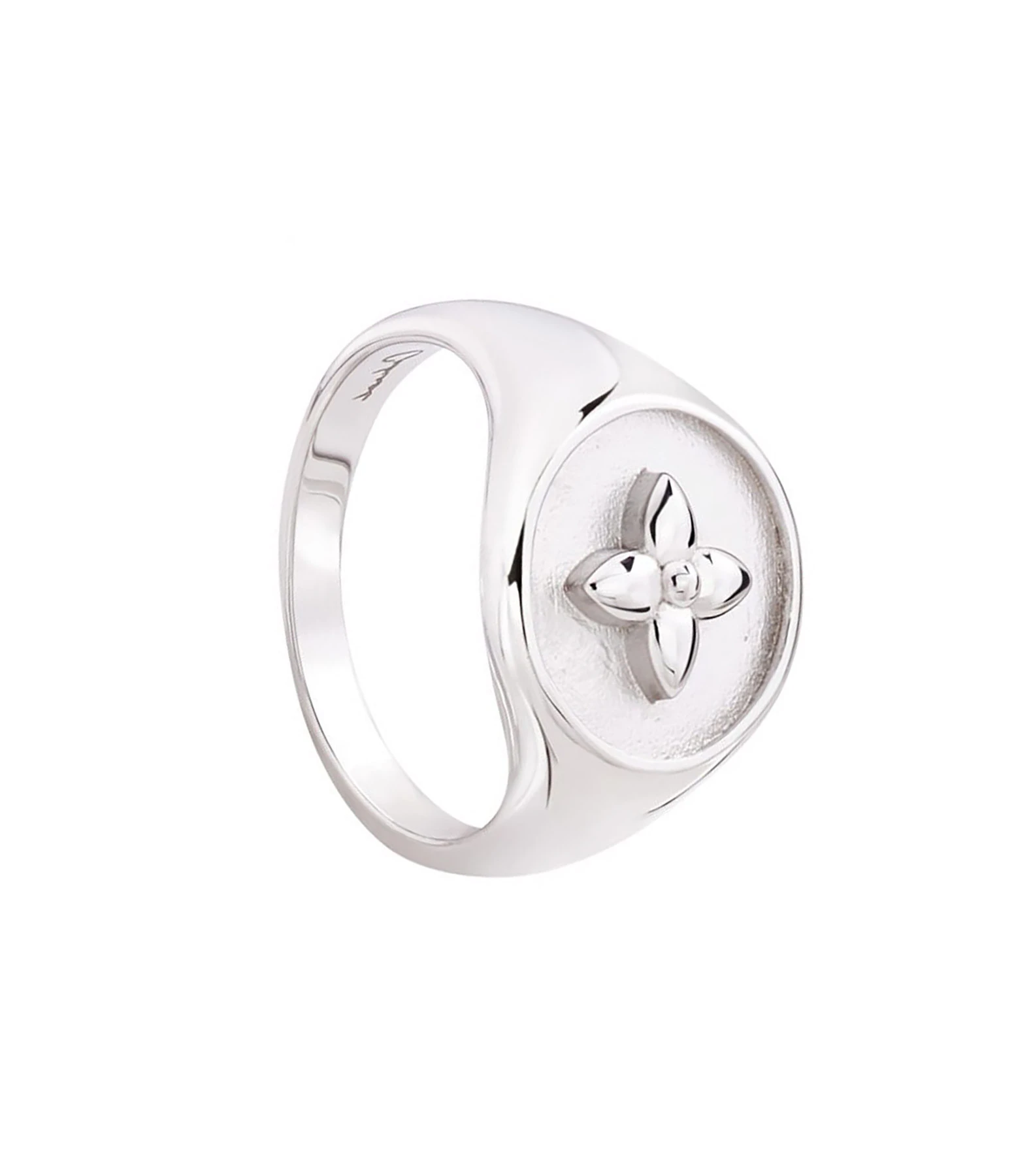 Chevalière ronde en argent avec symbole fleur “croisette de printemps”.