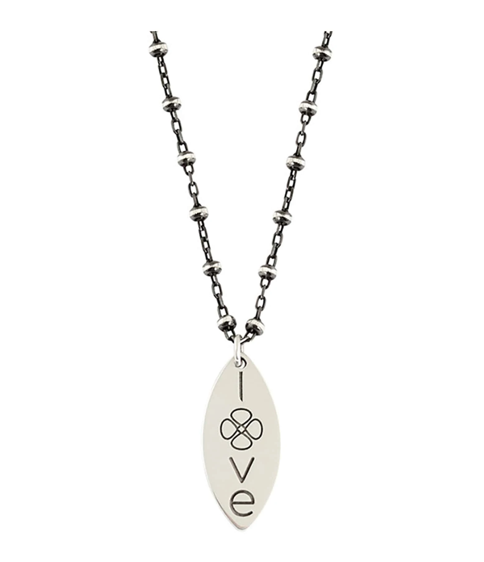 Collier en argent sur chaîne diamantée (petites perles facettées volontairement griffées), agrémenté d’un pendentif gravé “Love”.