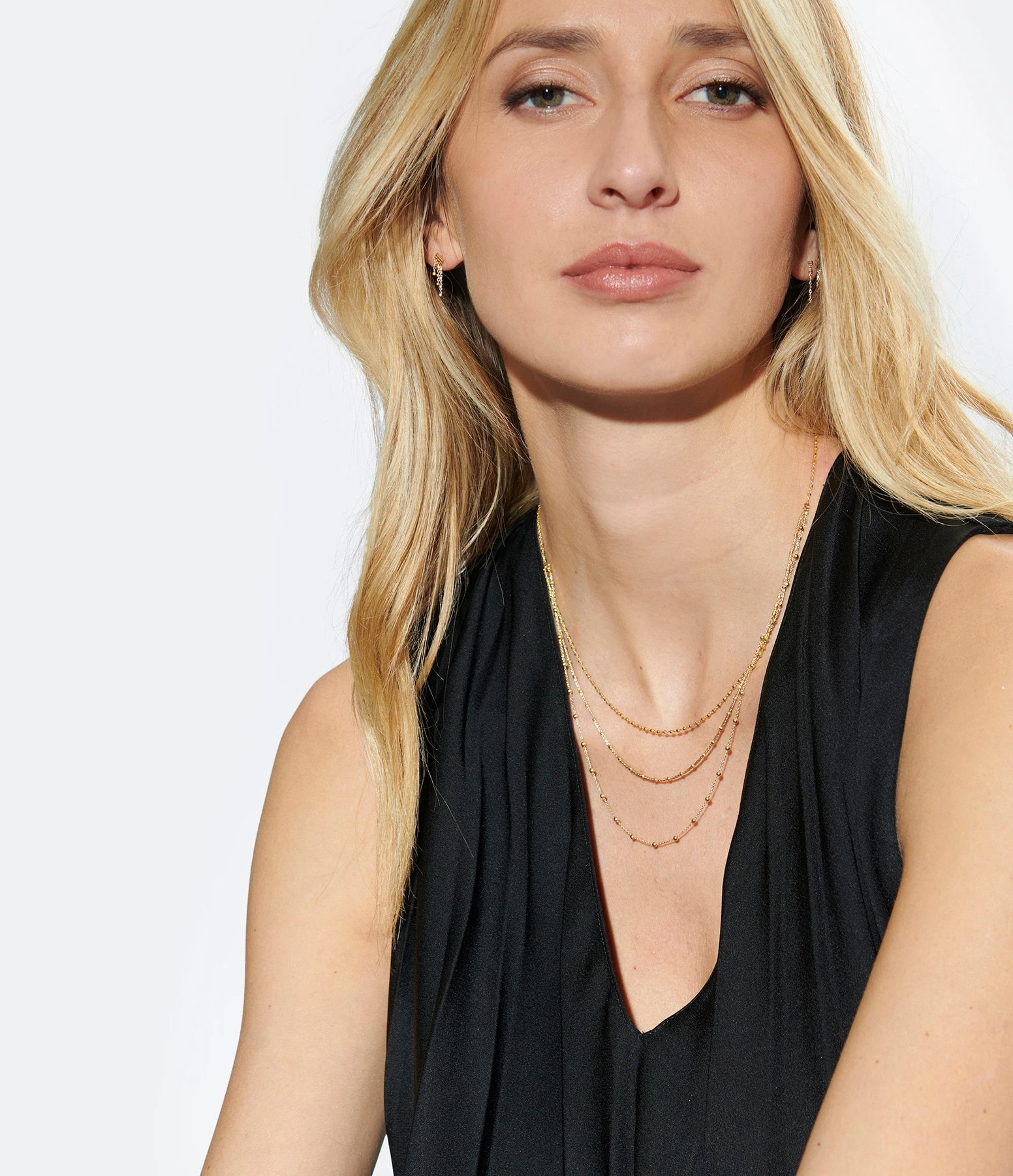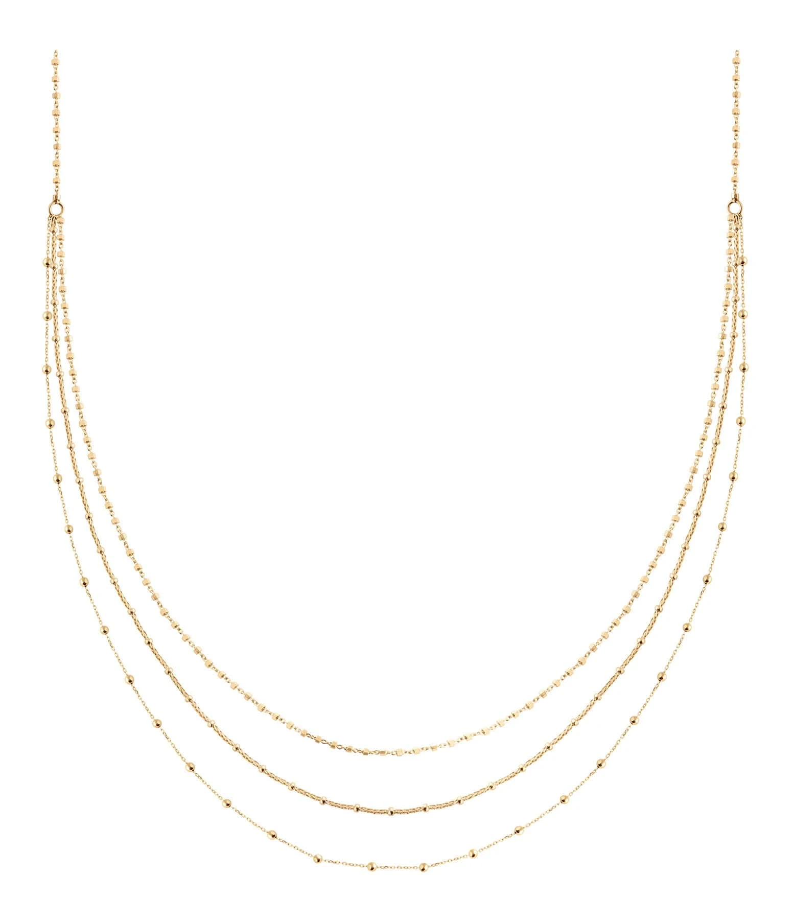 Collier en or jaune composé de trois chaînes (une chaîne diamantée, une chaîne tresse et une chaîne boule) montées en chute sur une chaîne en maille diamantée (ornée de petites perles facettées).