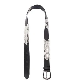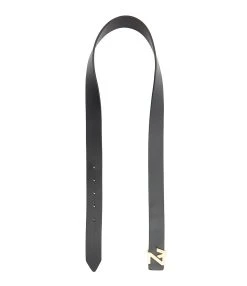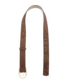 Ceinture en cuir suédé et cuir lamé jaune or. Fermeture par boucle métallique avec dix positions.