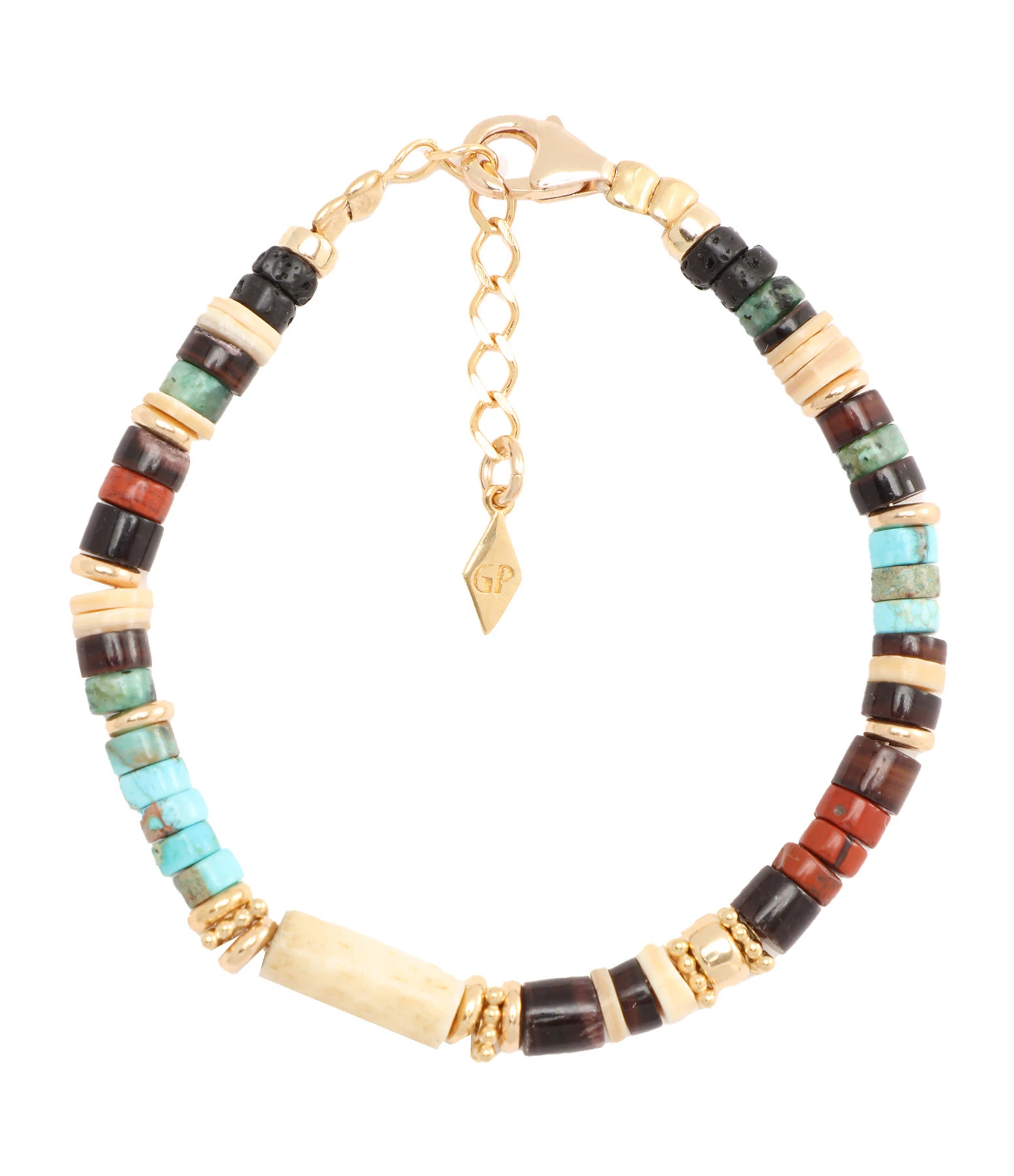 Bracelet en coquillages multicolores, pierres de turquoise, de jaspe et howlite avec des finitions en laiton doré. Fermoir mousqueton avec chaînette de réglage.