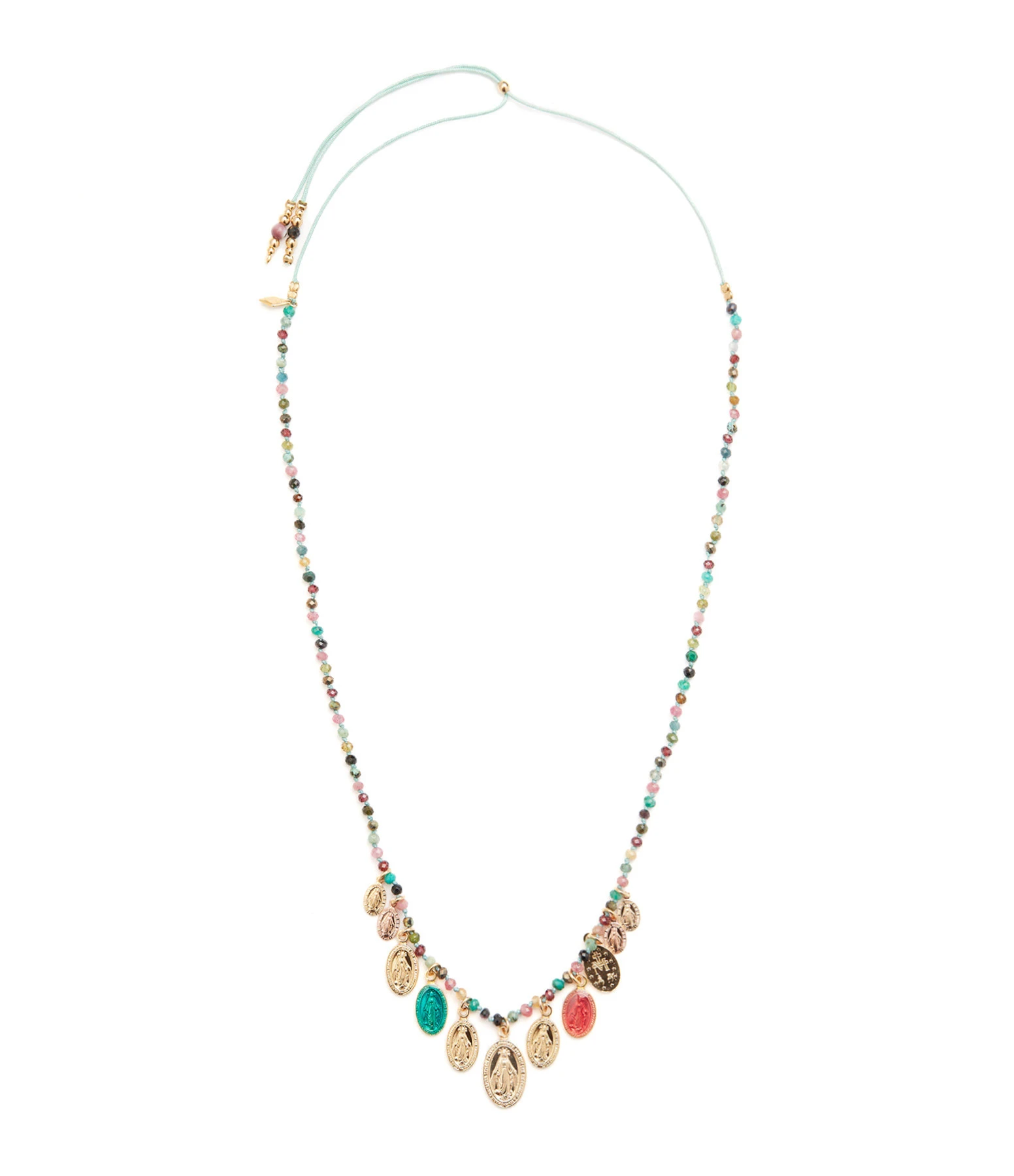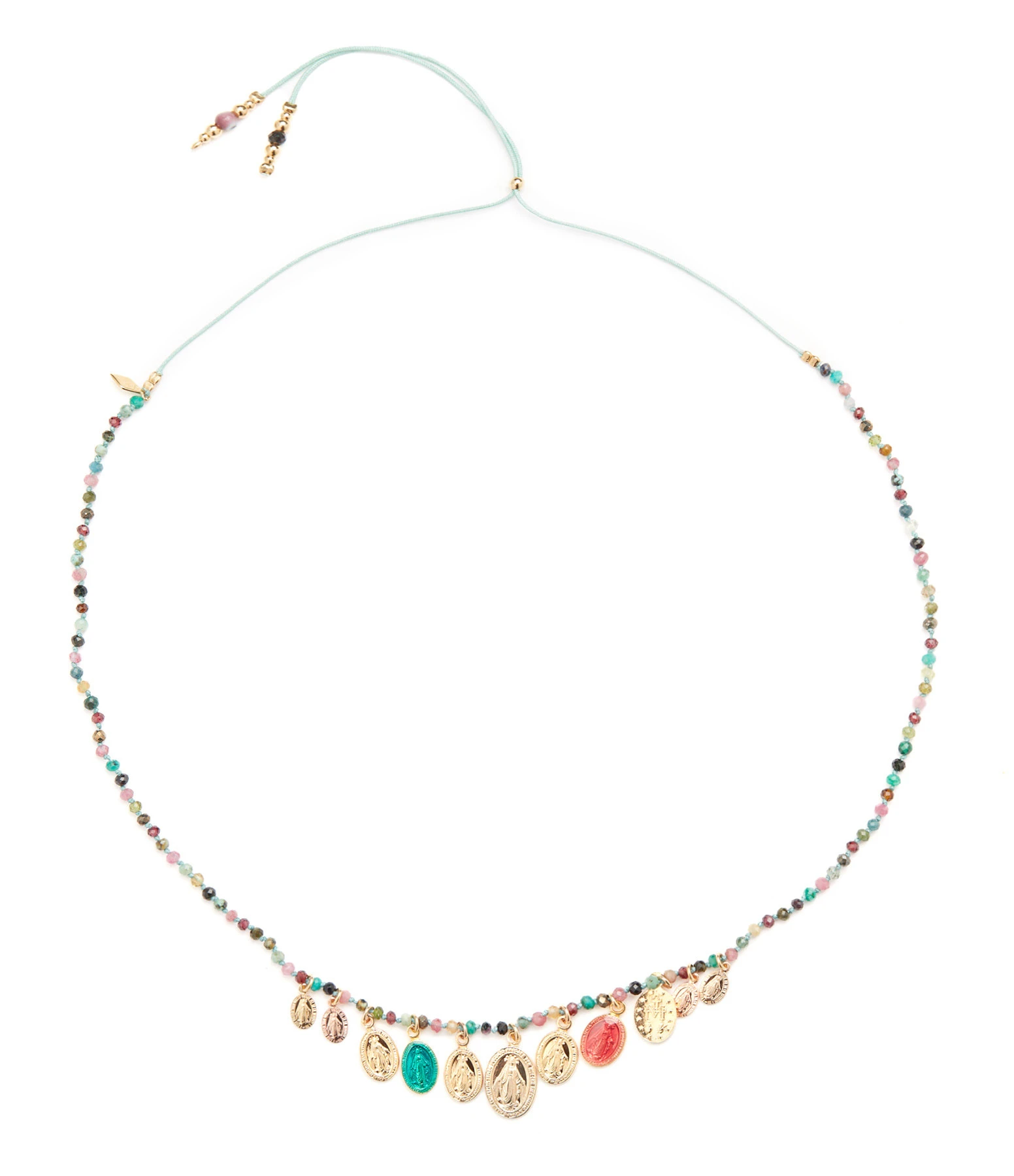 Collier sur cordon bleu coulissant serti de tourmaline multicolores facettées avec onze médailles de tailles différentes en laiton doré émaillé à l’effigie de la Vierge Marie.