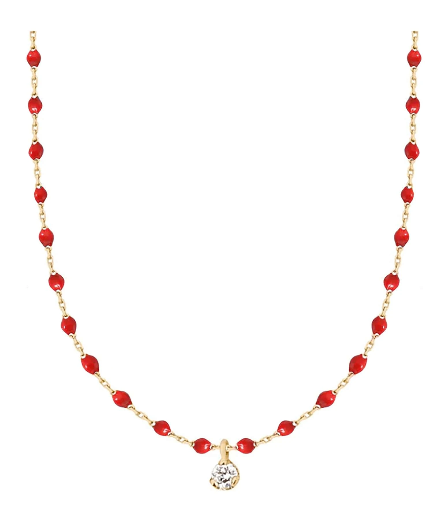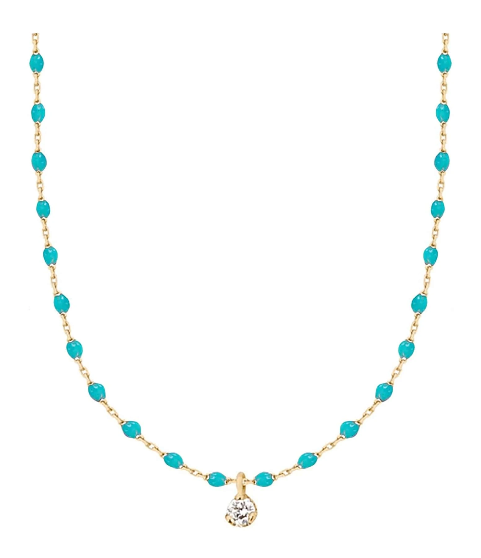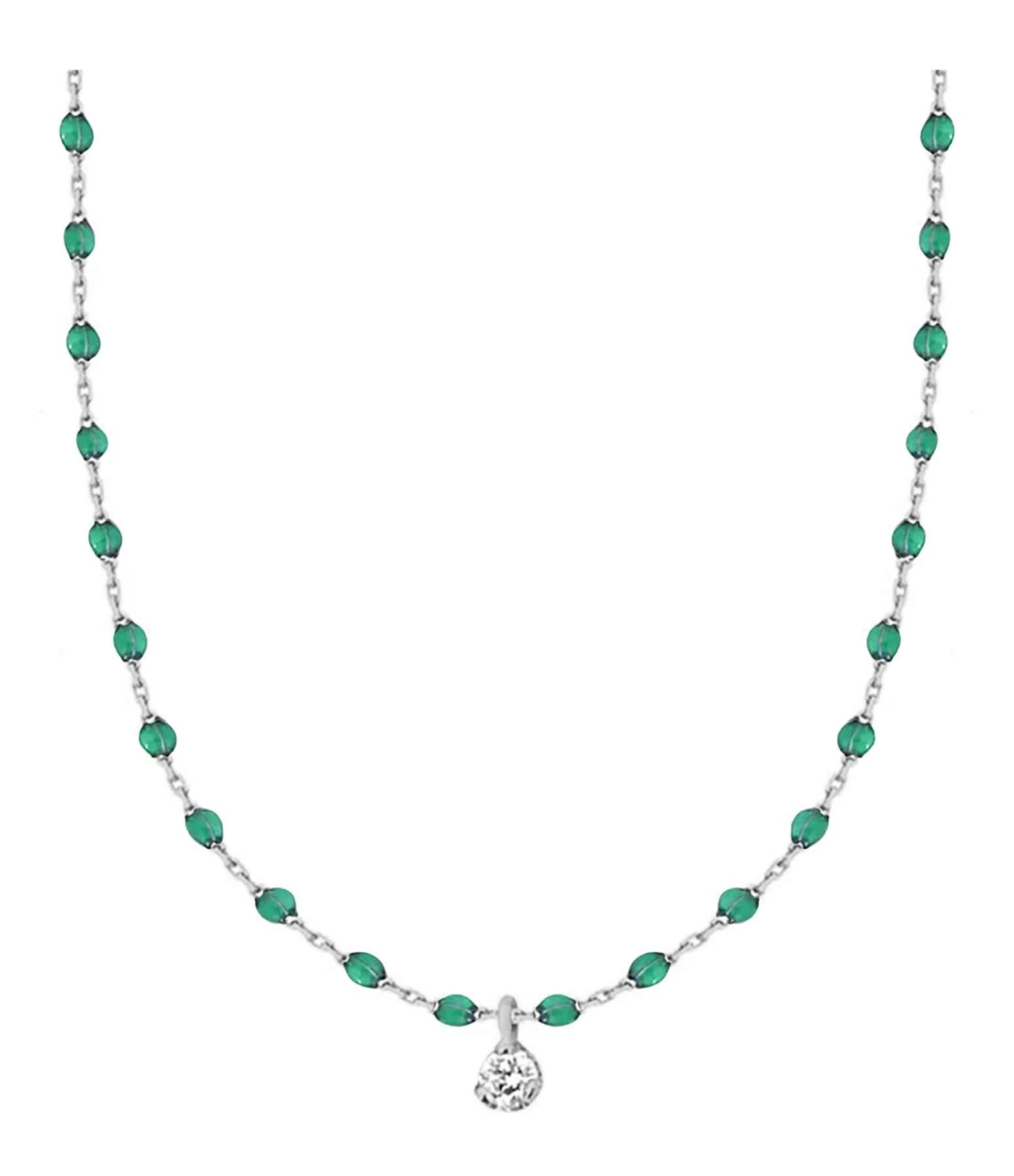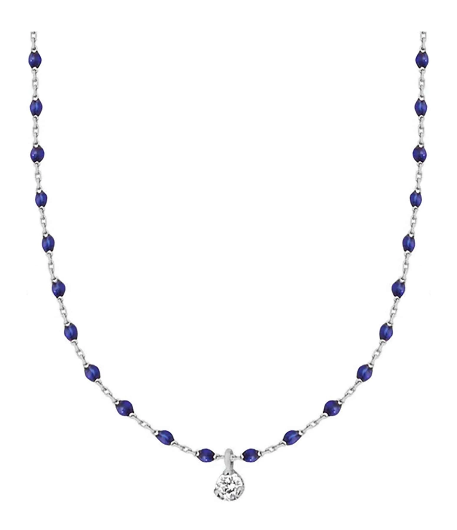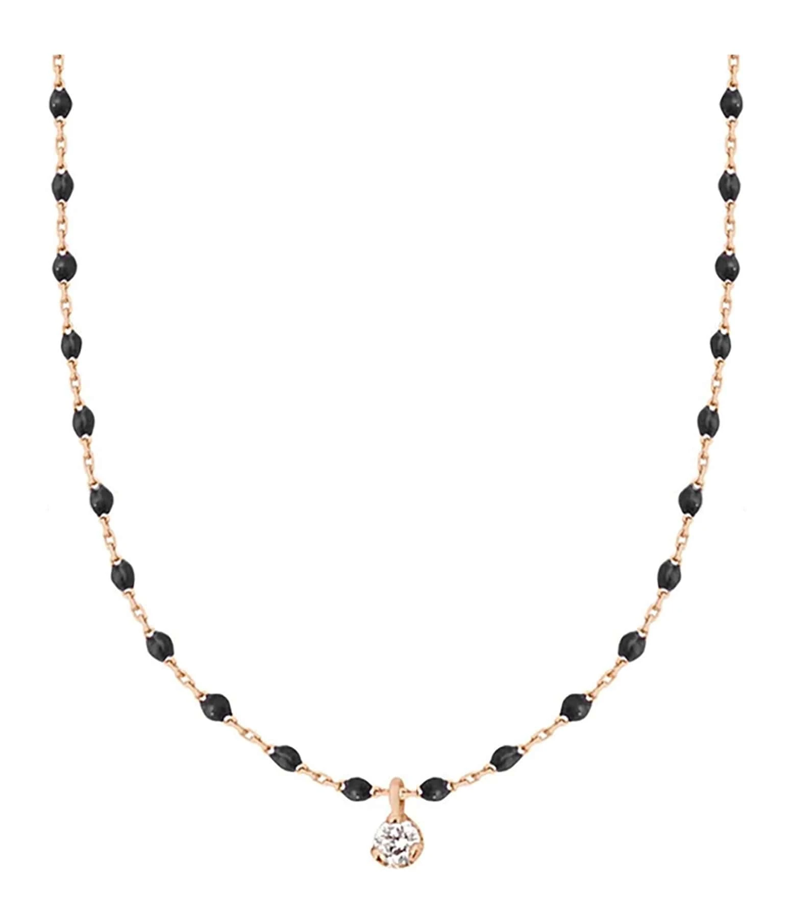 Collier sur chaîne en or rose, jaune ou gris agrémenté d’un diamant blanc et de mini perles de résine. Fermoir classique à ressort avec contre-anneau.