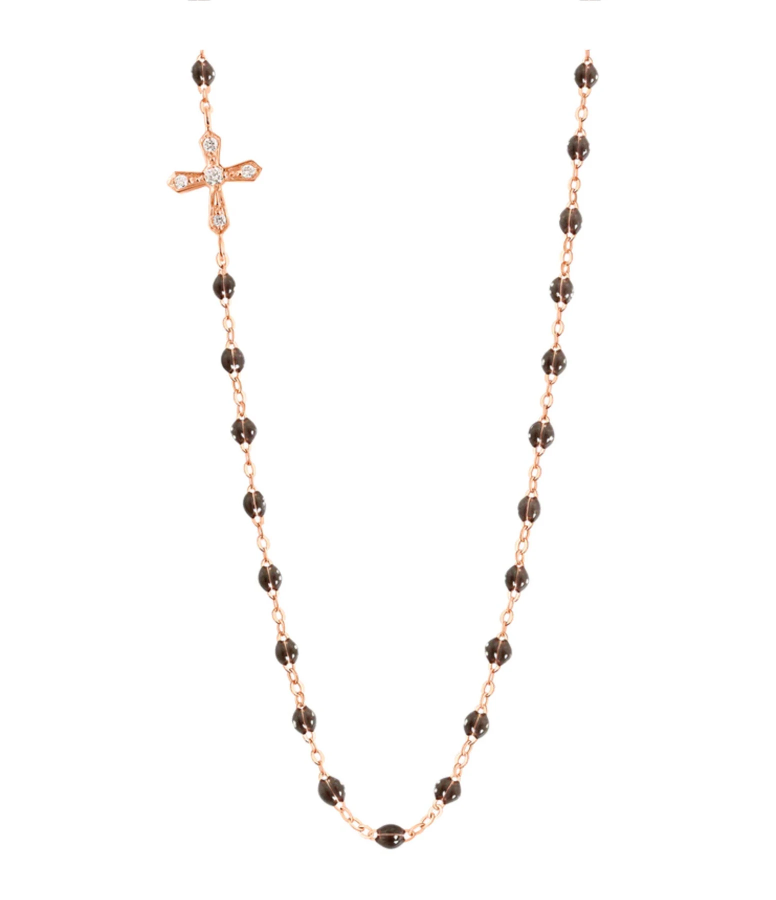 Collier sur chaîne en or rose, jaune ou gris agrémenté d’une Croix sertie de quatre diamants blancs et de perles de résine. Fermoir classique à ressort avec contre-anneau.