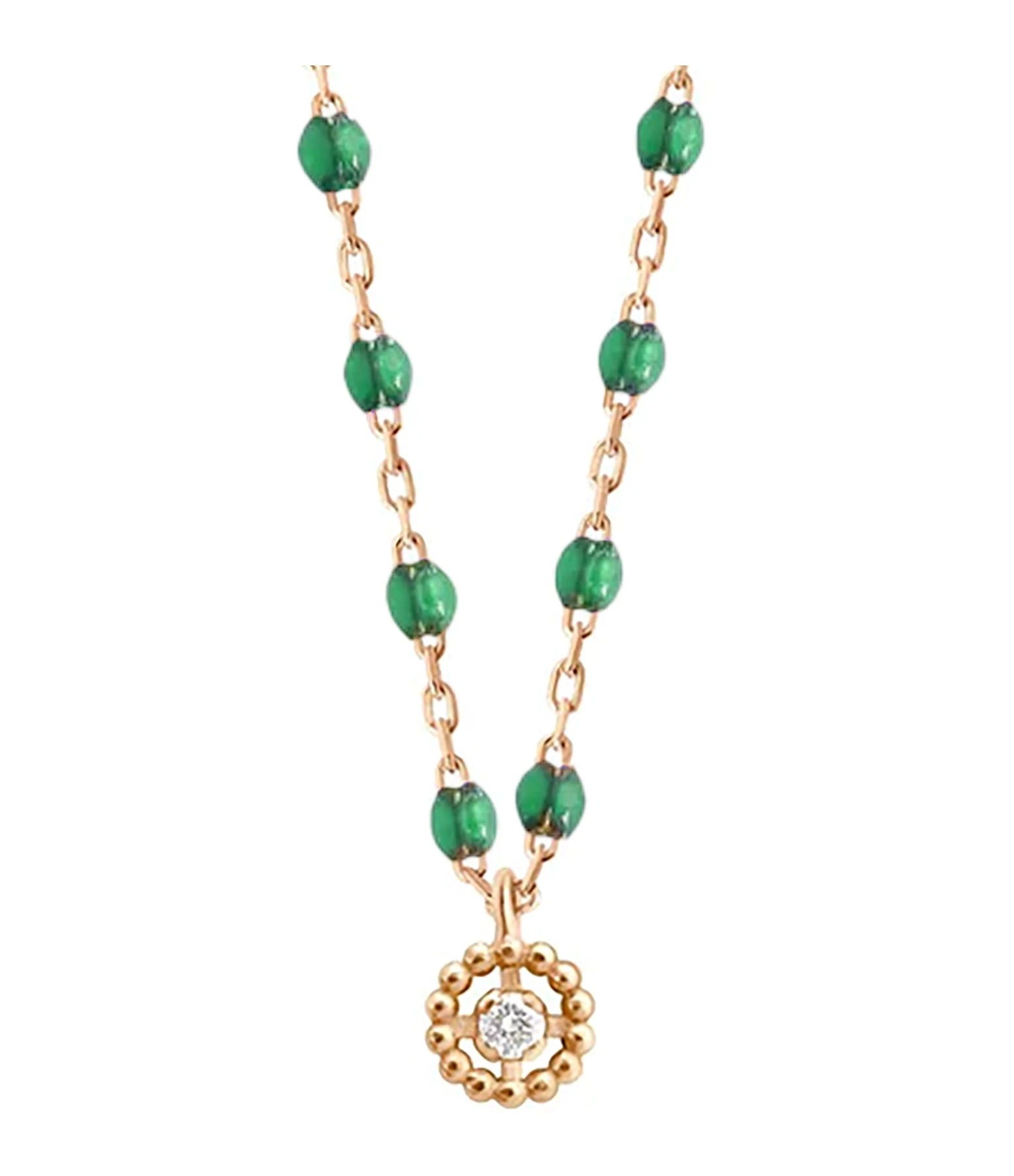Collier sur chaîne en or rose ou jaune agrémenté de mini perles de résine et d’un pendentif serti d’un diamant. Fermoir classique à ressort avec contre anneau.Le modèle or blanc est proposé uniquement en résine noire.