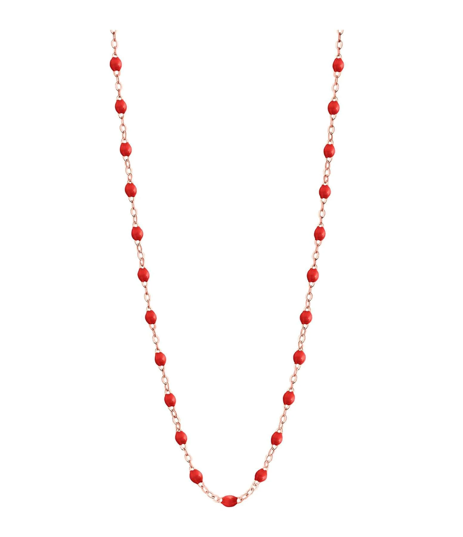 Collier sur chaîne en or gris, jaune ou rose agrémenté de perles de résine. Fermoir classique à ressort avec contre-anneau.