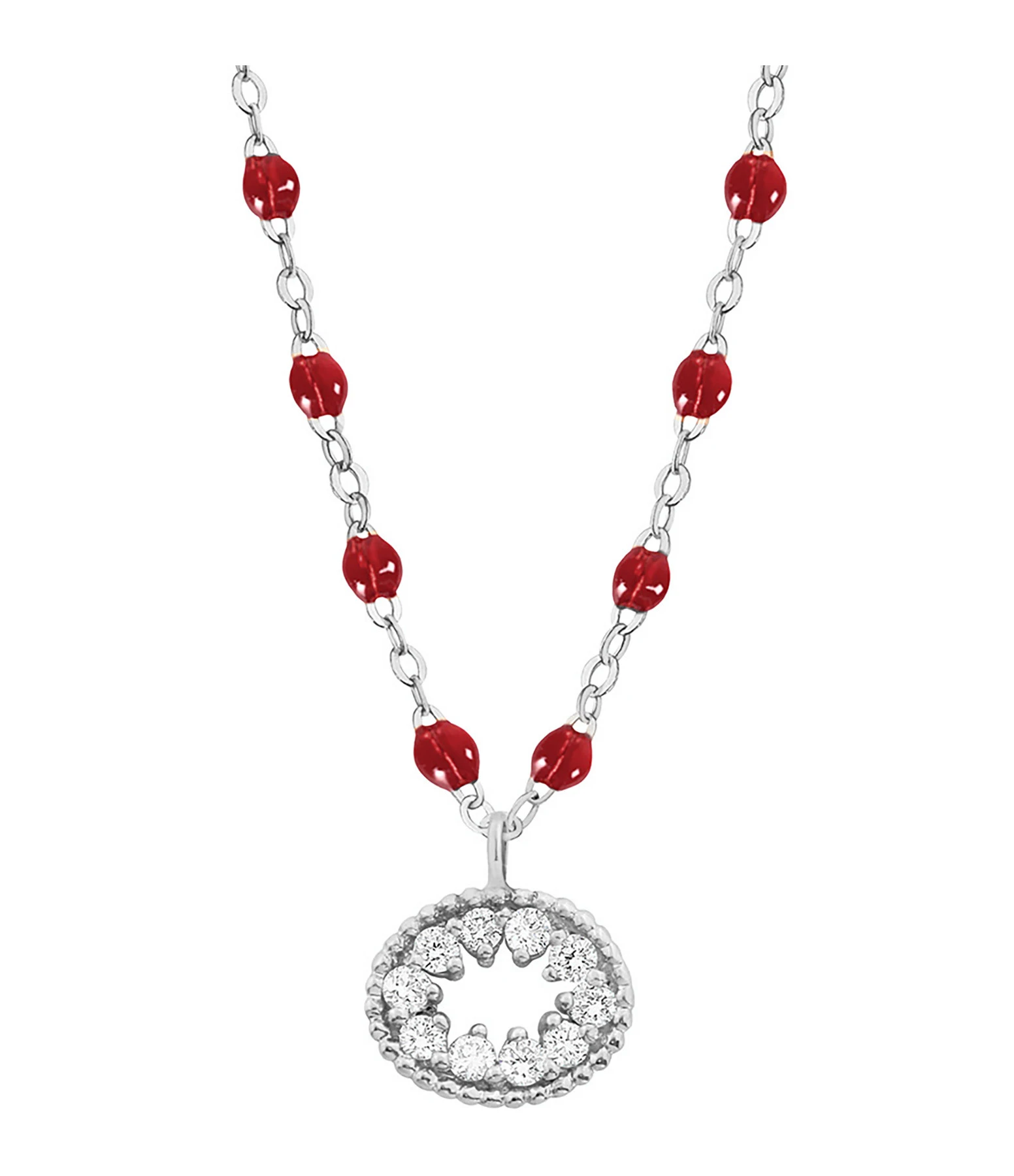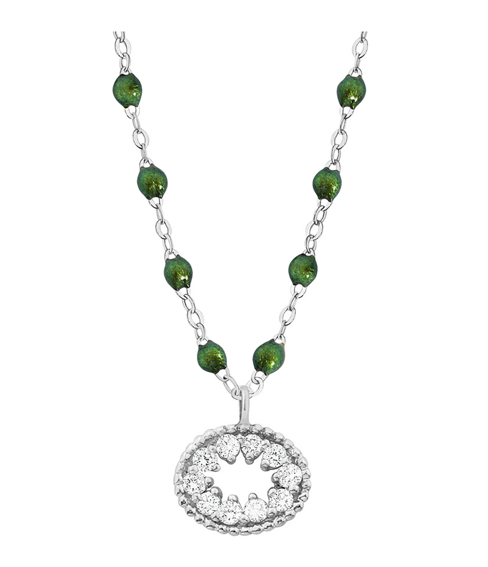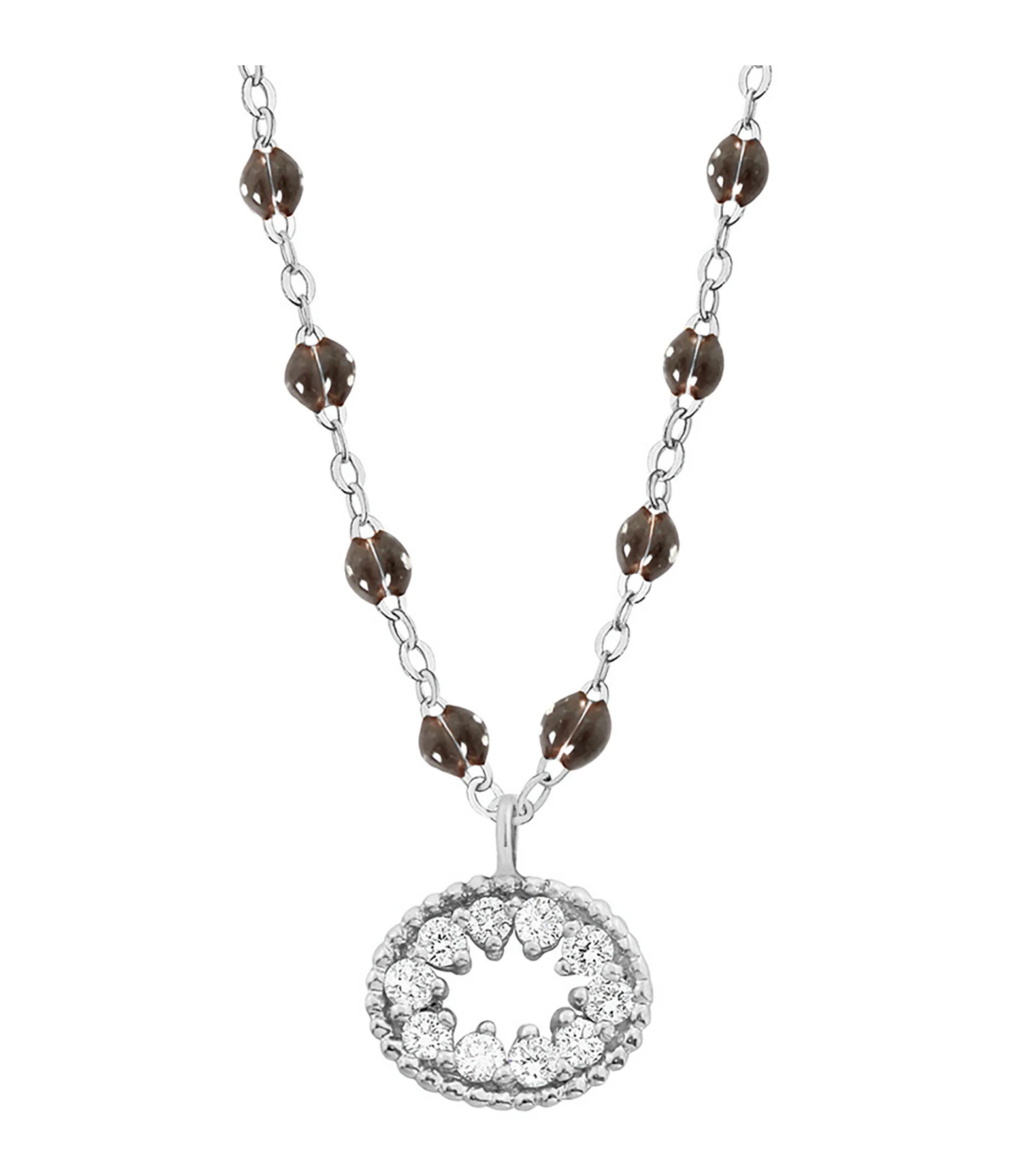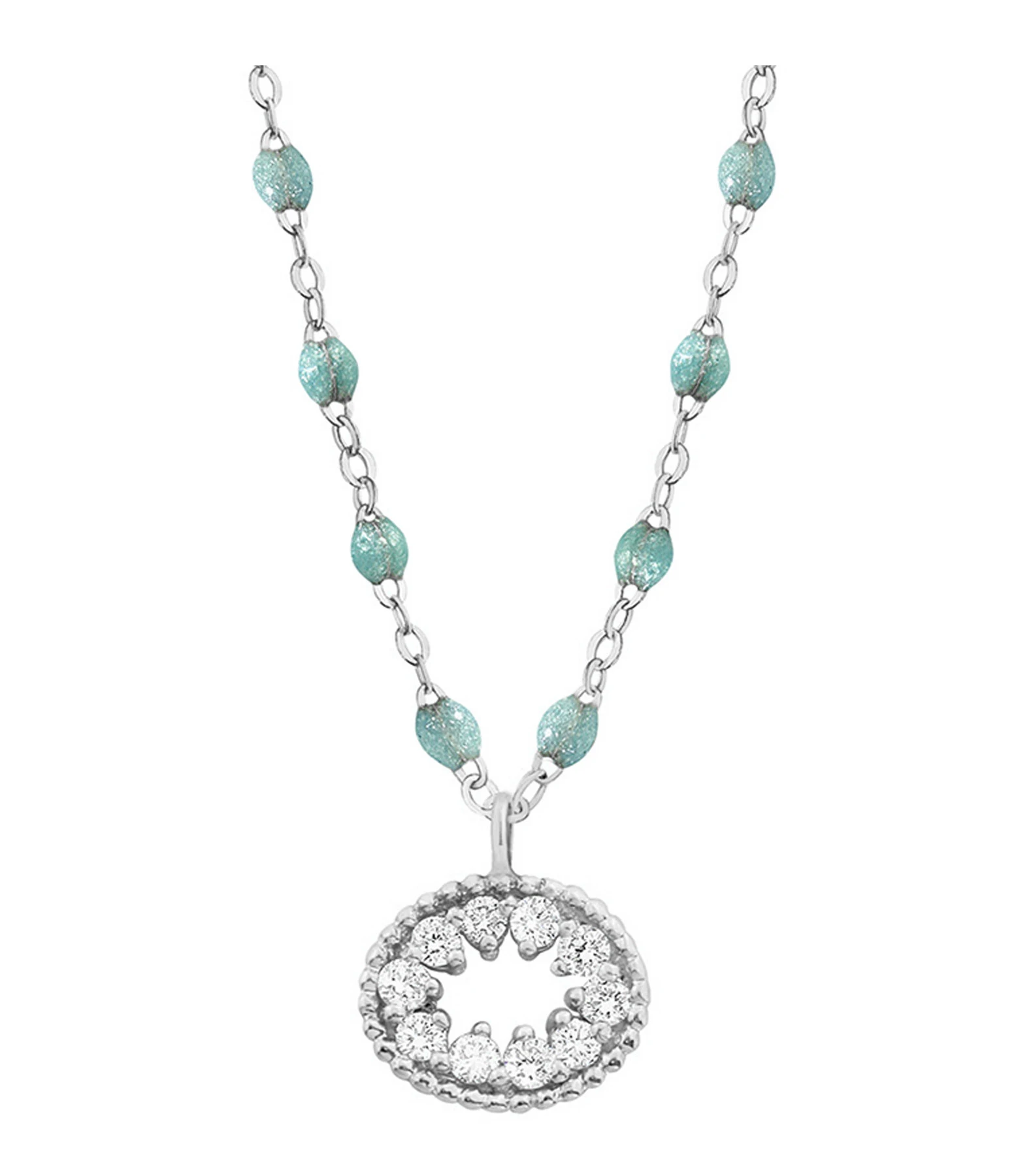 Collier sur chaîne en or blanc agrémenté d’un pendentif en forme d’œil serti de diamants et de mini perles de résine. Fermoir classique à ressort avec contre-anneau.