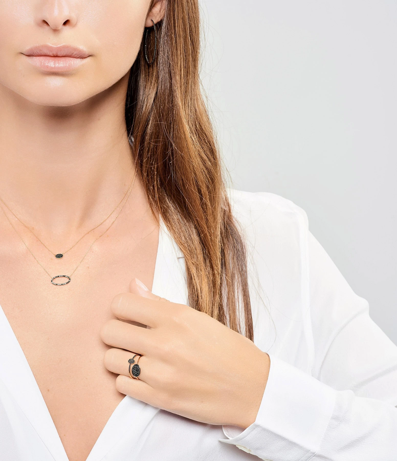 Bague en or rose avec motif ovale serti de diamants noirs.