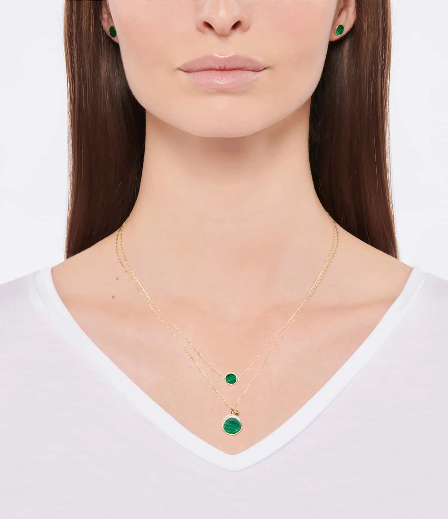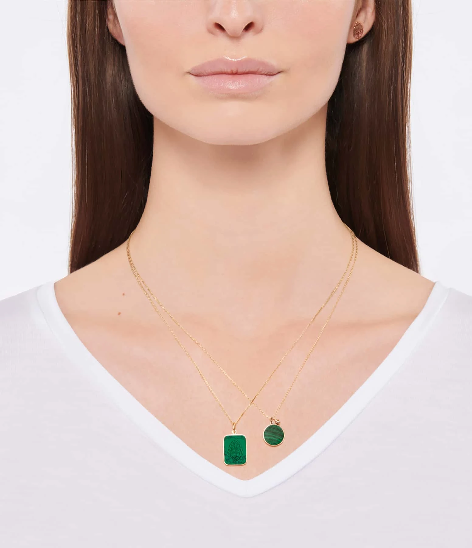Collier sur chaîne en or rose avec pendentif en pierre de malachite verte. Fermoir classique avec contre-anneau et ressort.