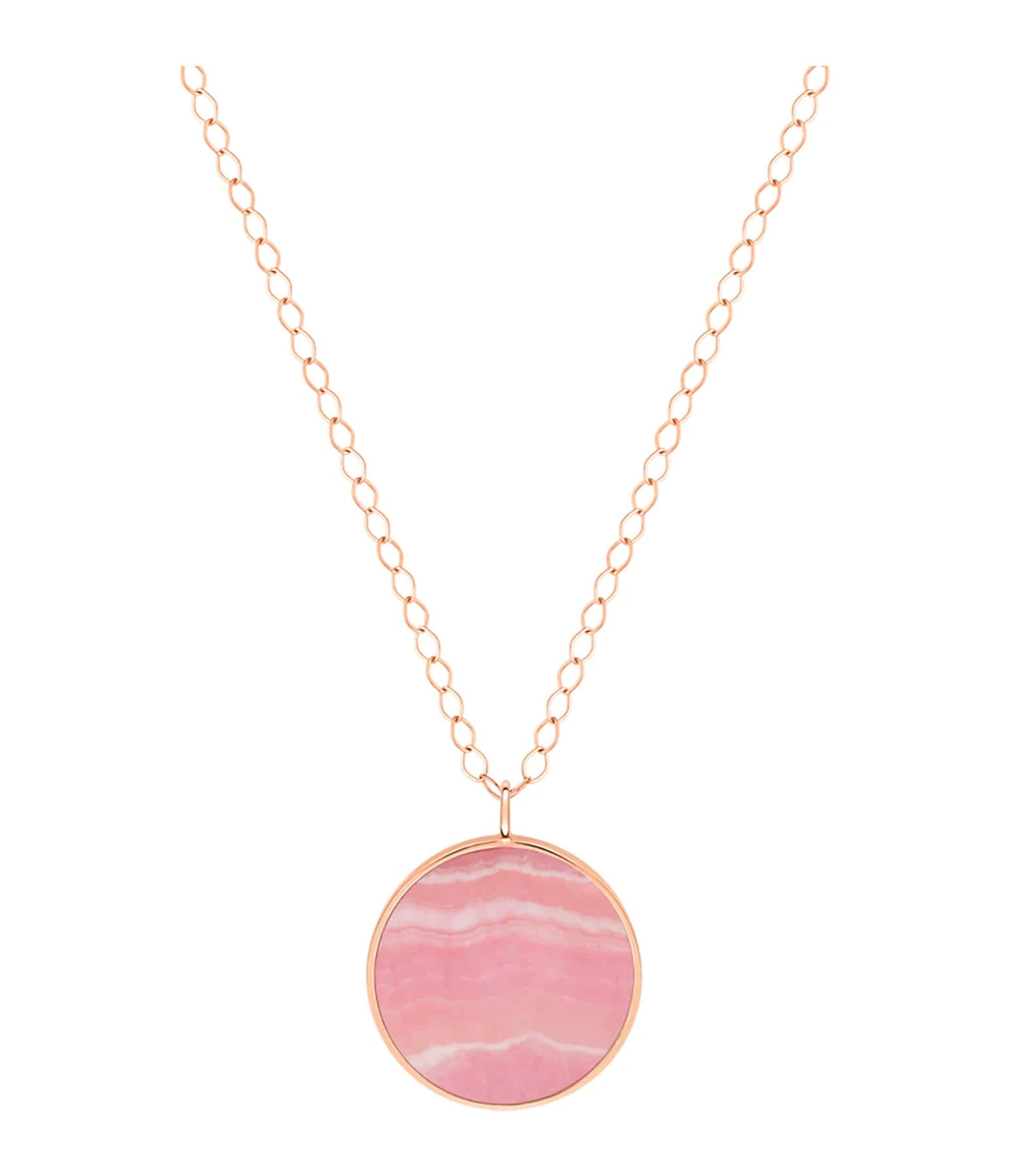 Collier sur chaîne en or rose avec pendentif en pierre de rhodochrosite rose . Fermoir classique avec contre-anneau et ressort.