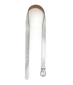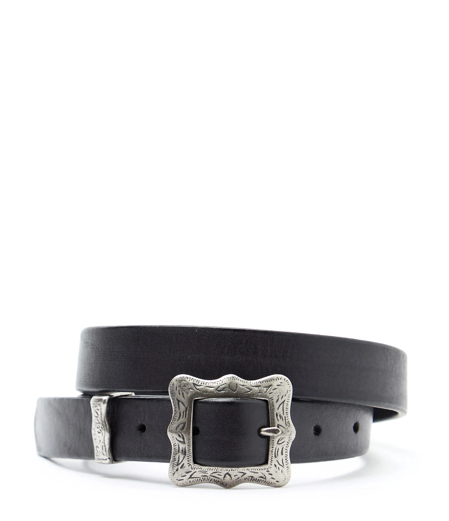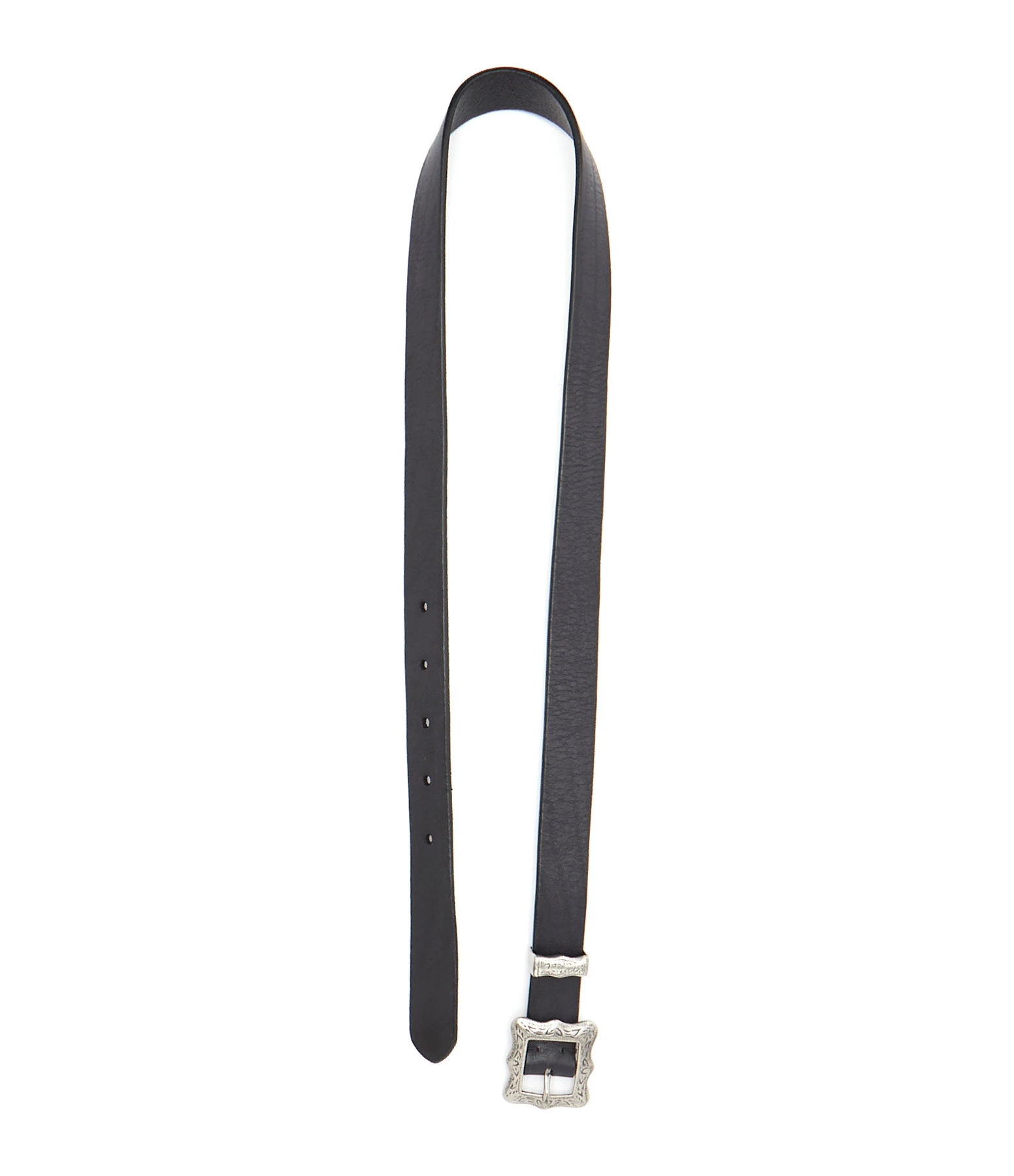Ceinture en cuir noir. Boucle argentée.