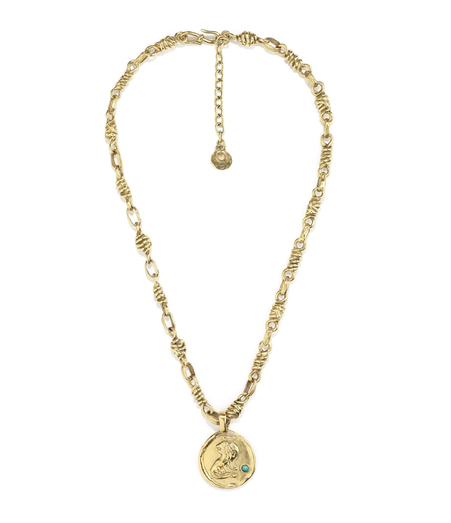 Collier en plaqué or, orné d’un médaillon du signe astrologique du Lion, décoré d’une turquoise. Fermoir en S avec contre-anneau.