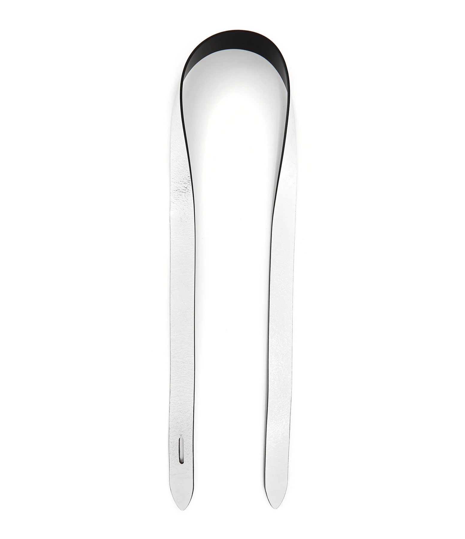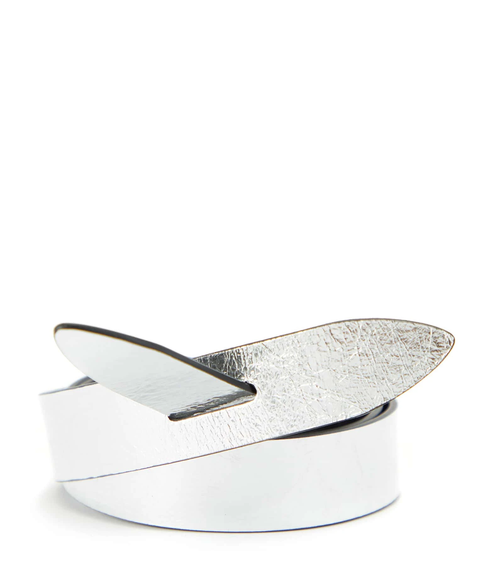 Ceinture à nouer en cuir argenté. Extrémités pointues et une fente d’un côté permettant de faire le nœud.