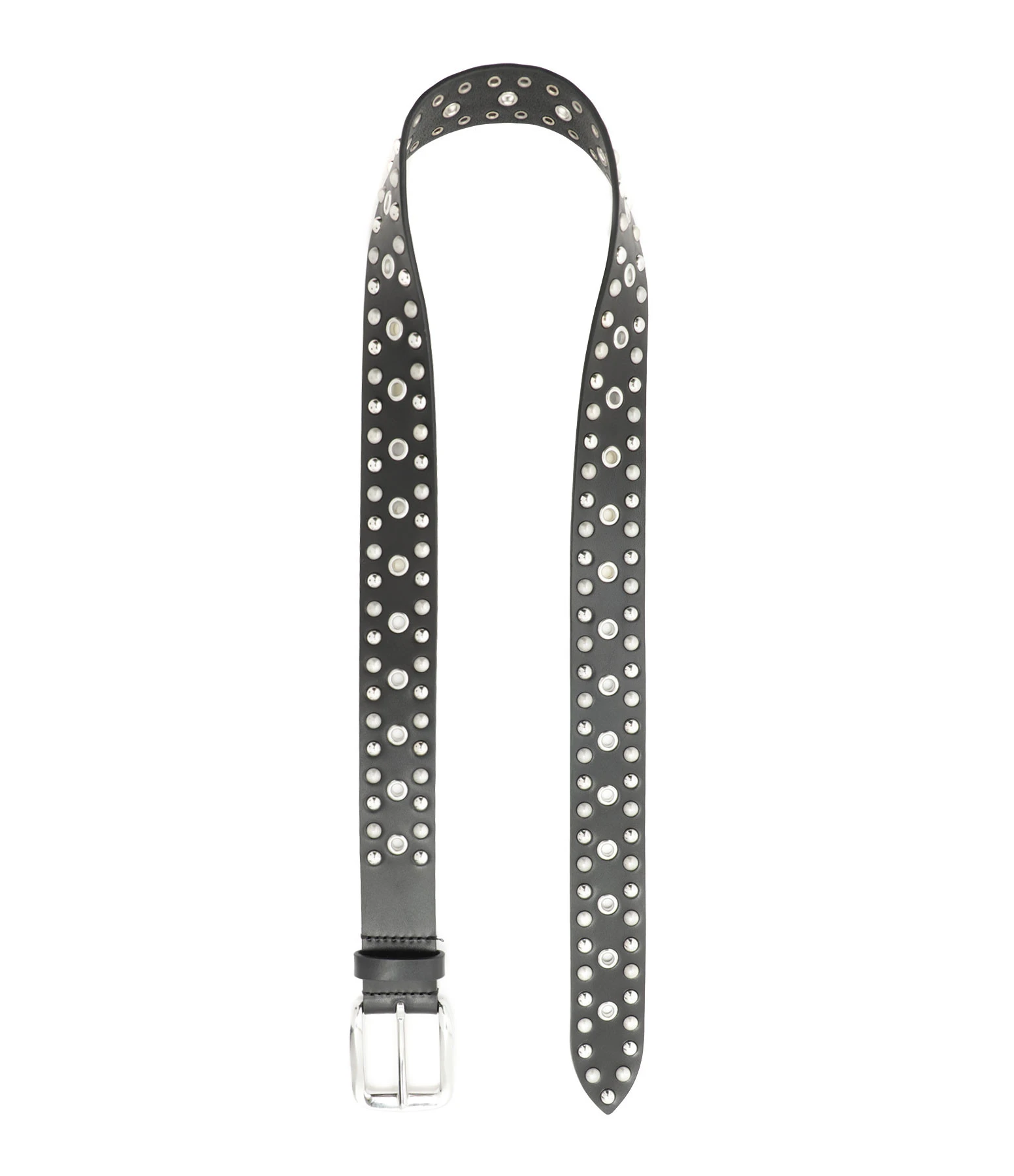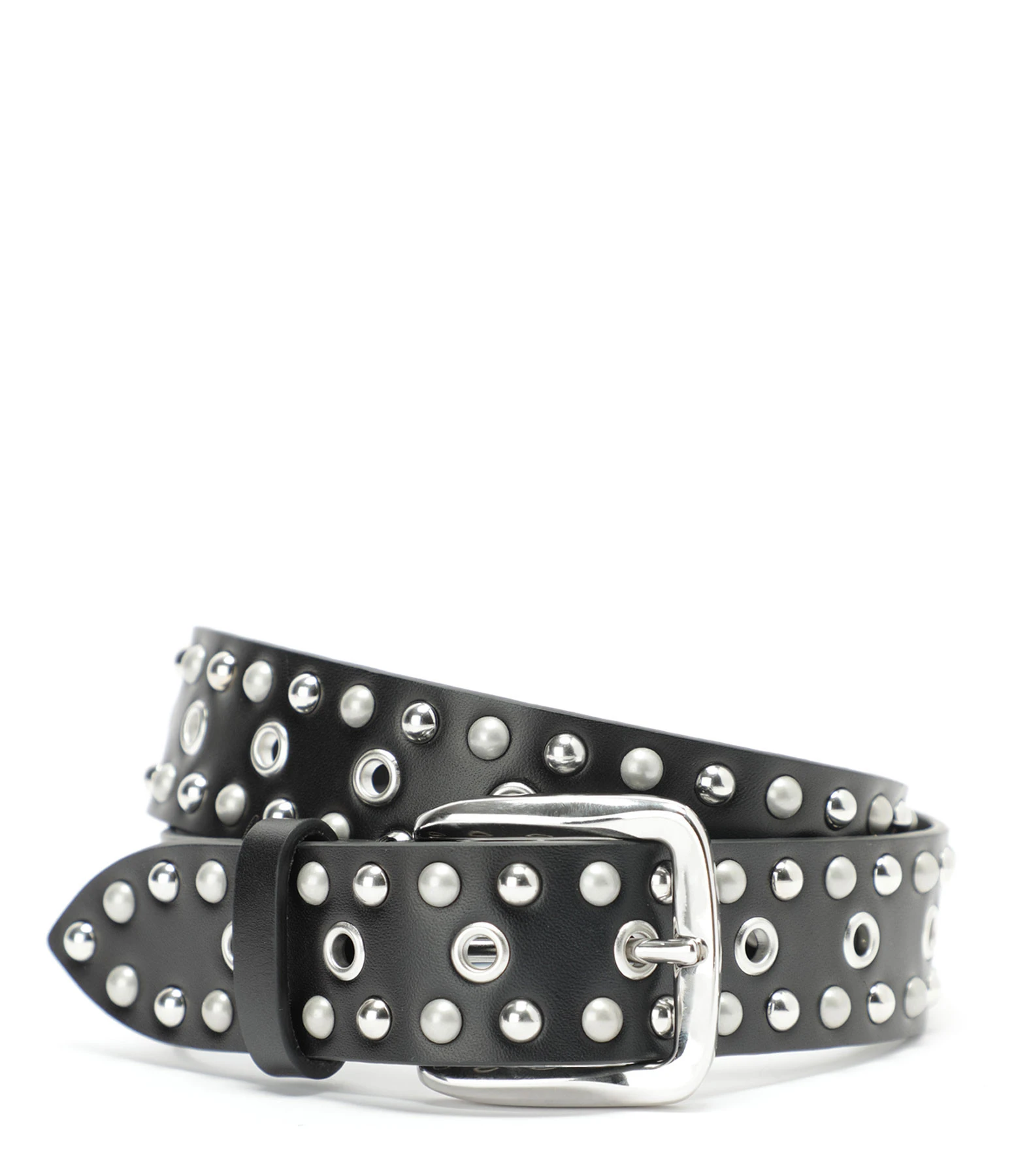 Ceinture en cuir noir. Ćillets et rivets argentĂ©s sur toute la longueur. Boucle argentĂ©e.