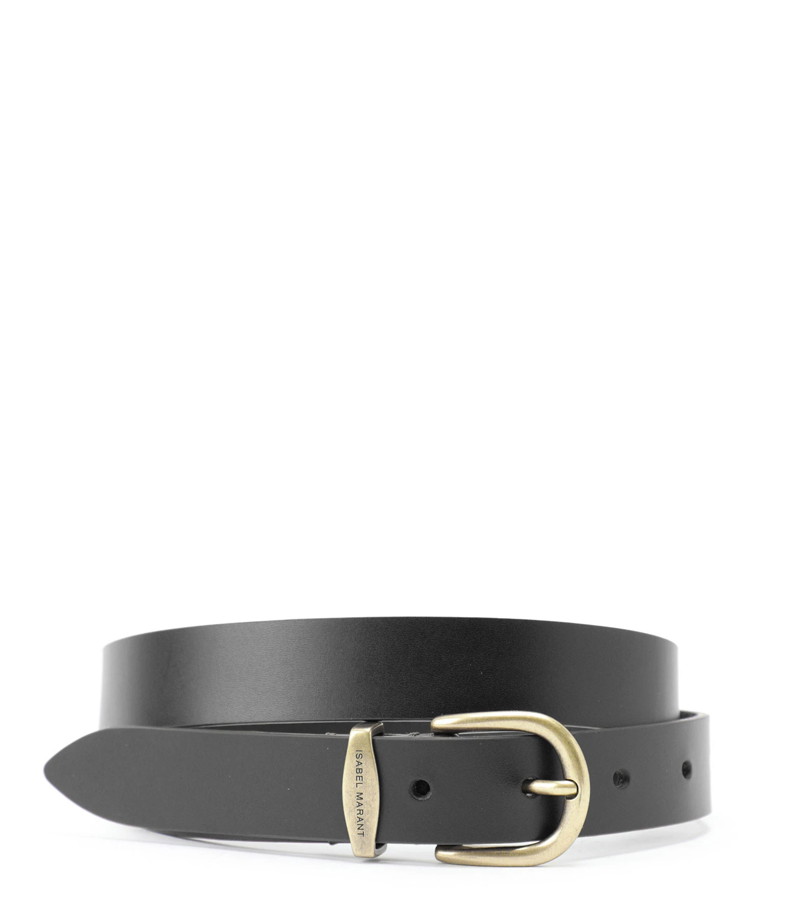 Ceinture en cuir lisse noir. Boucle en métal doré. Fermoir avec cinq positions.