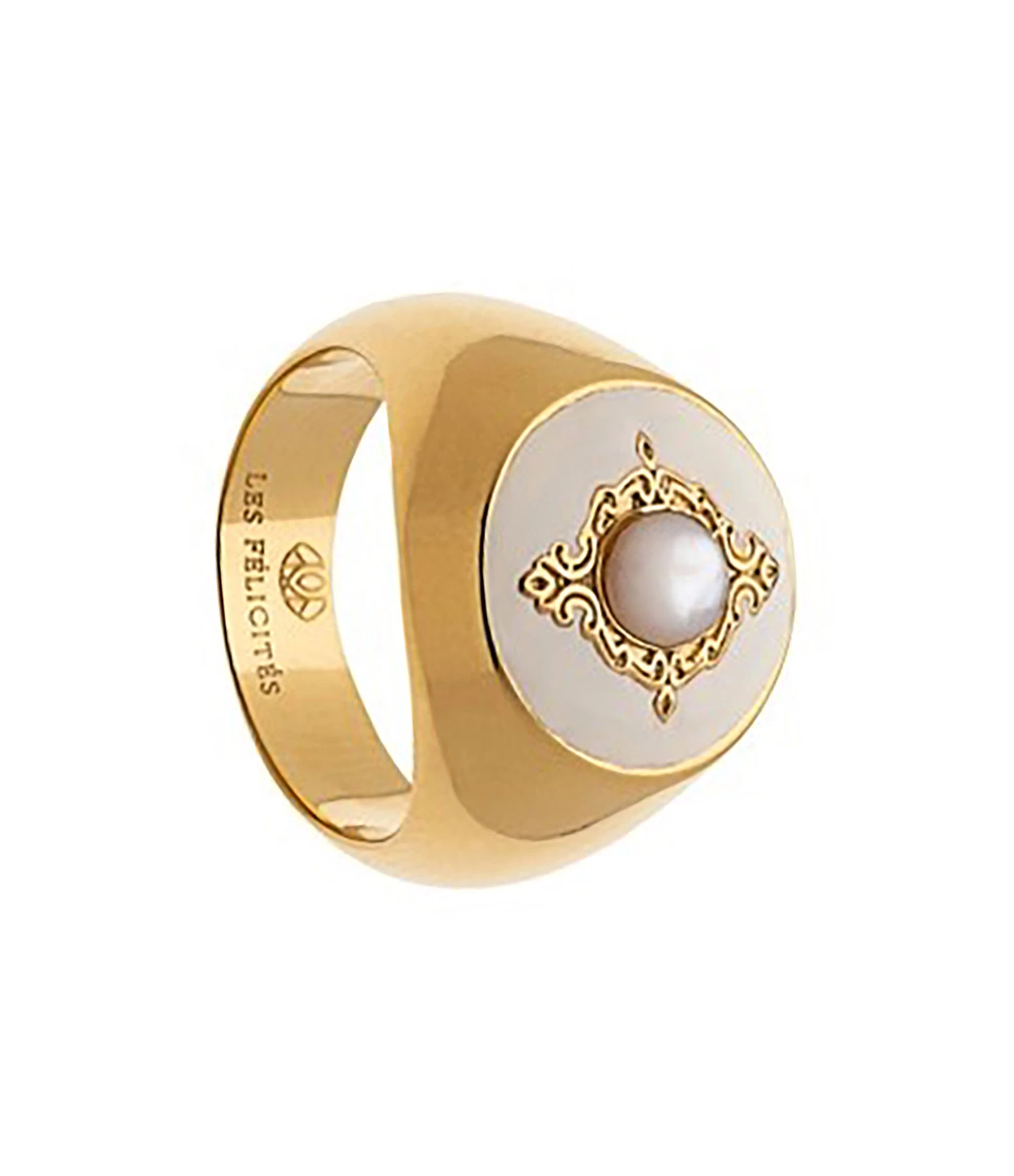 Chevalière ovale en plaqué or avec émail ivoire et pierre de nacre au centre.
