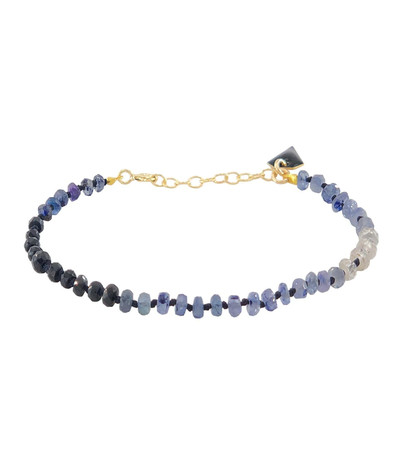 Bracelet en cordon noir et saphir bleu. Fermoir et chaîne de réglage en argent plaqué or.