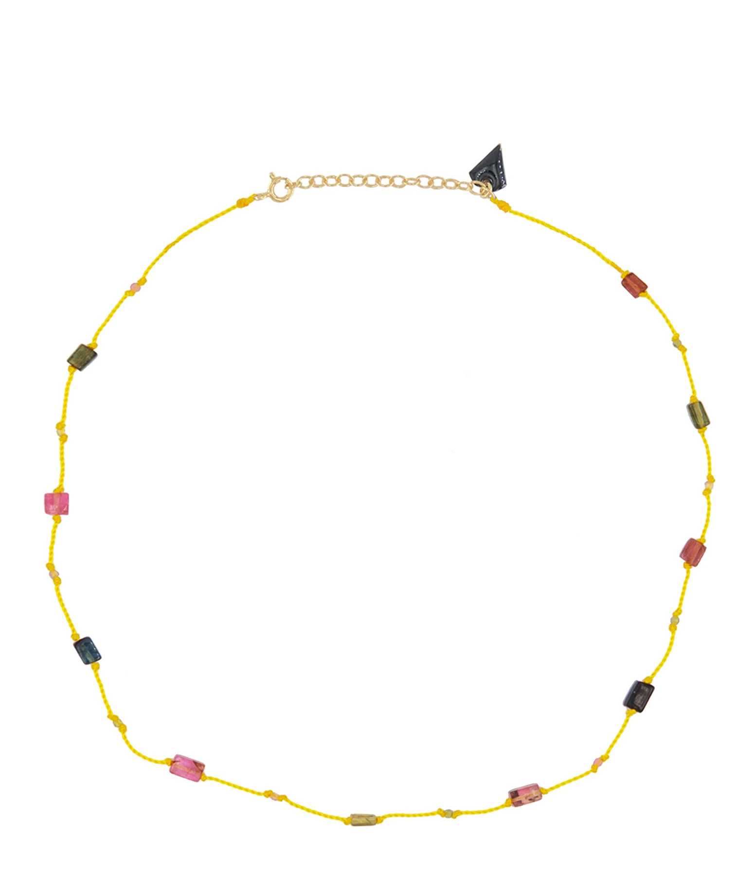 Collier en fin cordon jaune. Pierres de tourmaline. Fermeture par fermoir doré.