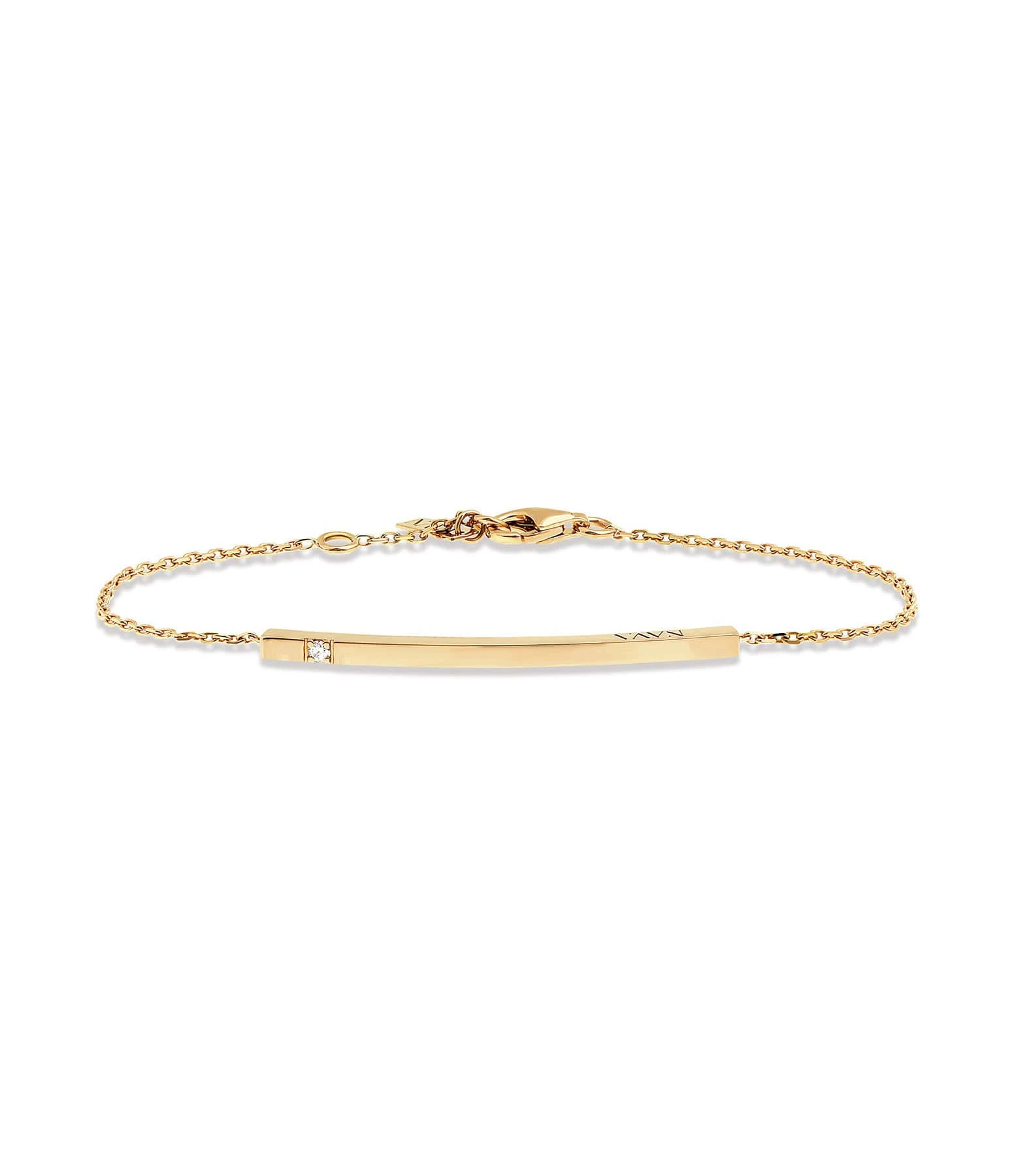 Bracelet chaîne en or jaune avec barrette sertie d’un diamant rond. Fermoir à ressort avec contre-anneau.