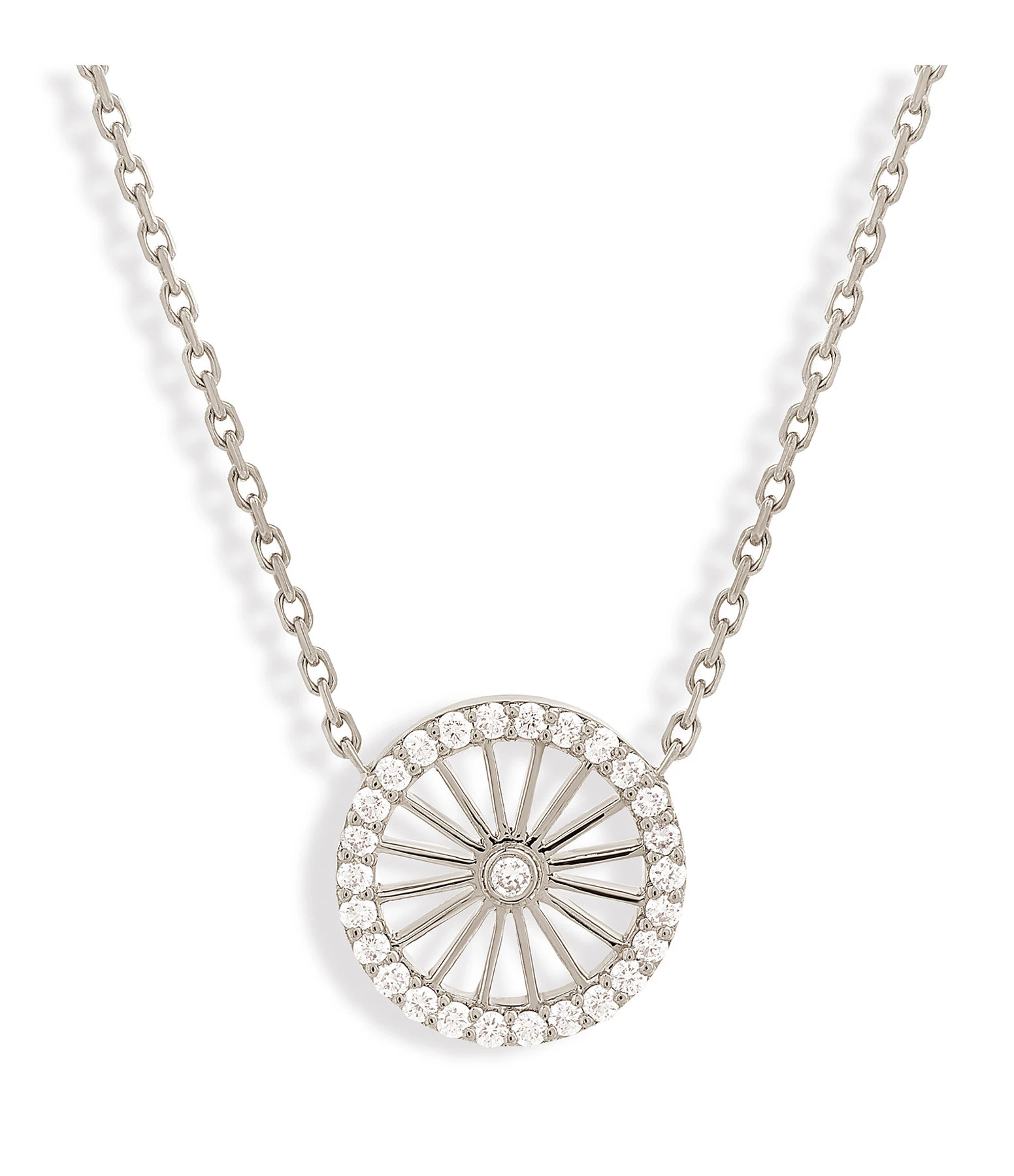 Collier en or blanc avec pendentif rond serti de diamants ronds. Fermoir à ressort.