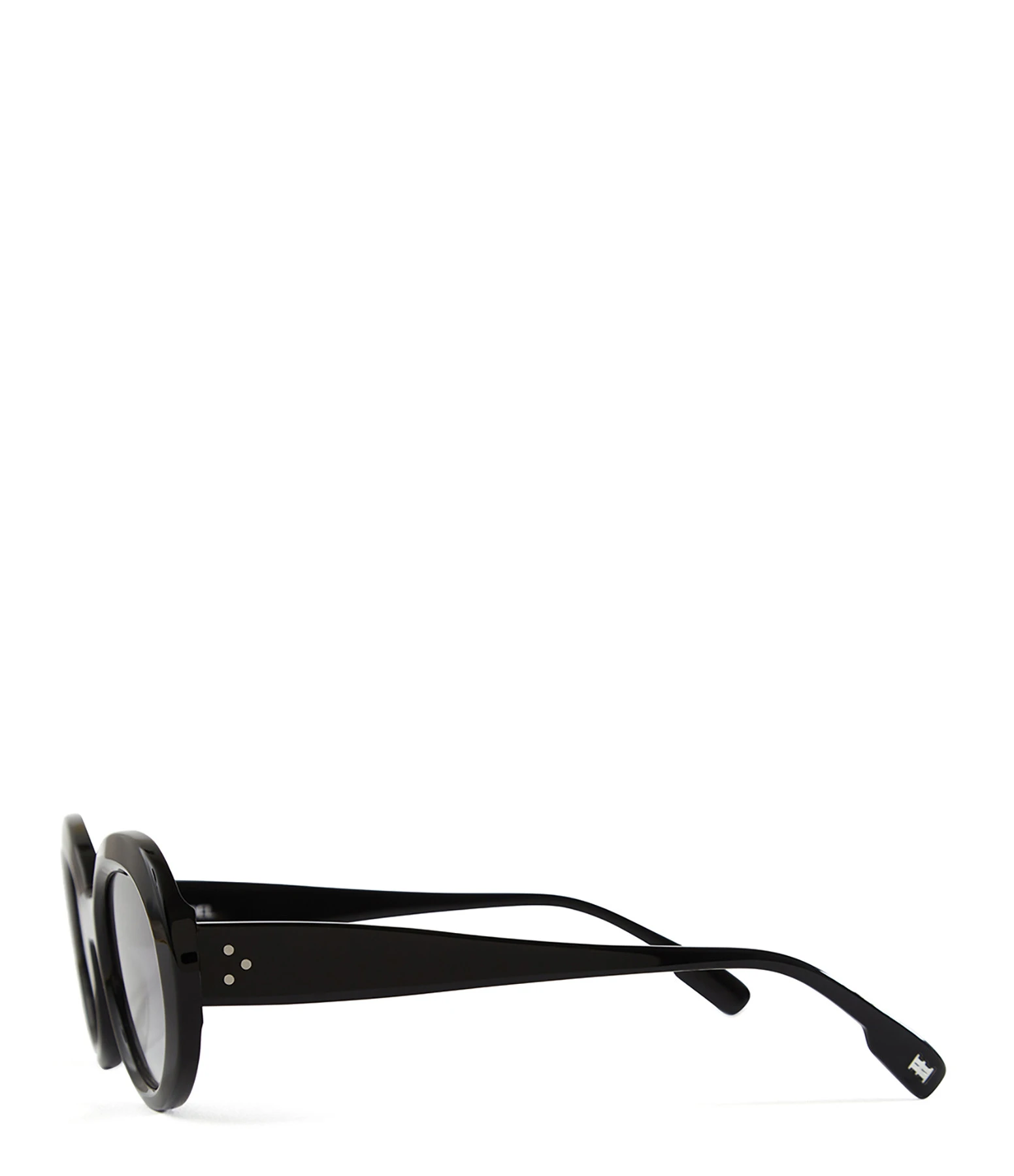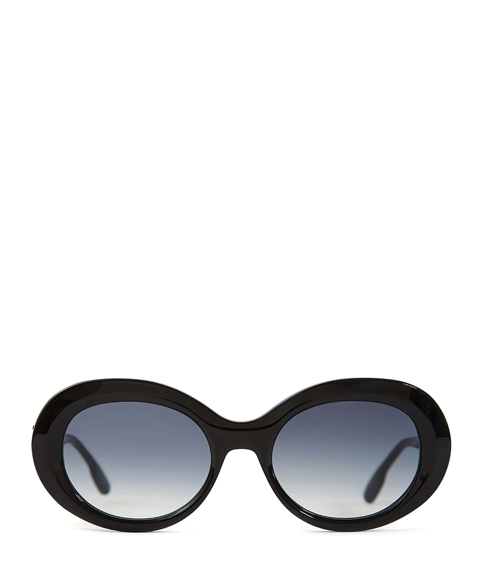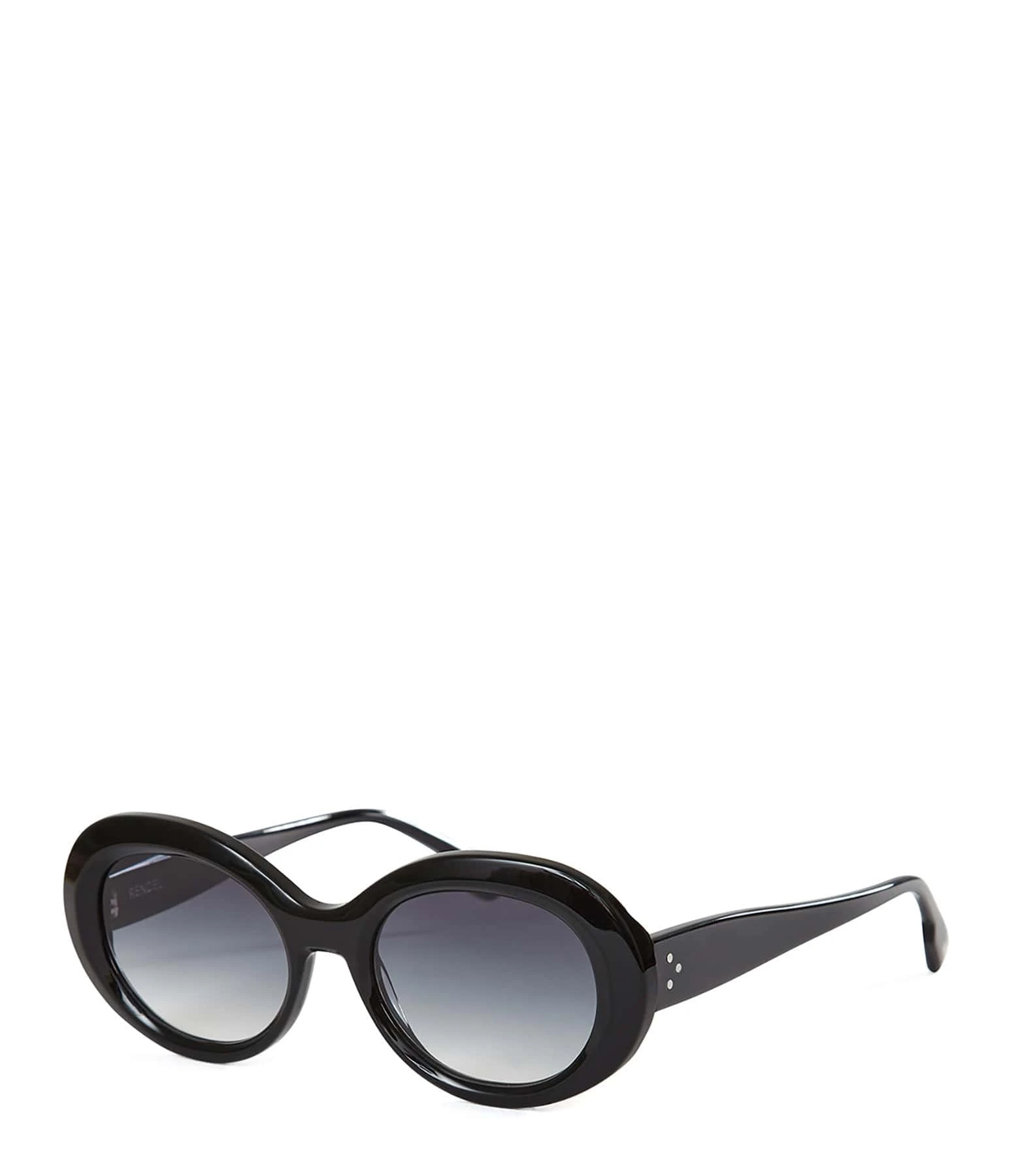 Lunettes de soleil forme ovales noires pour femme. Verres fumés bleus gris.