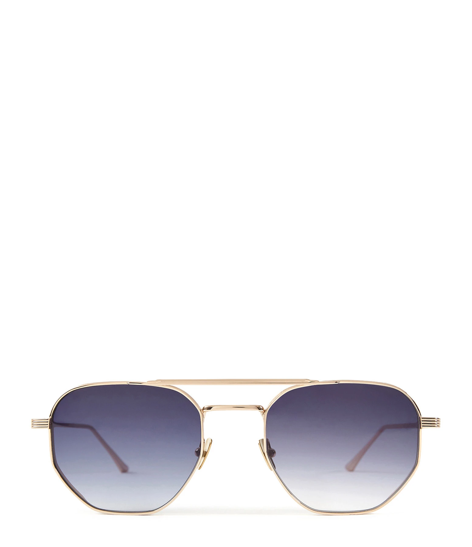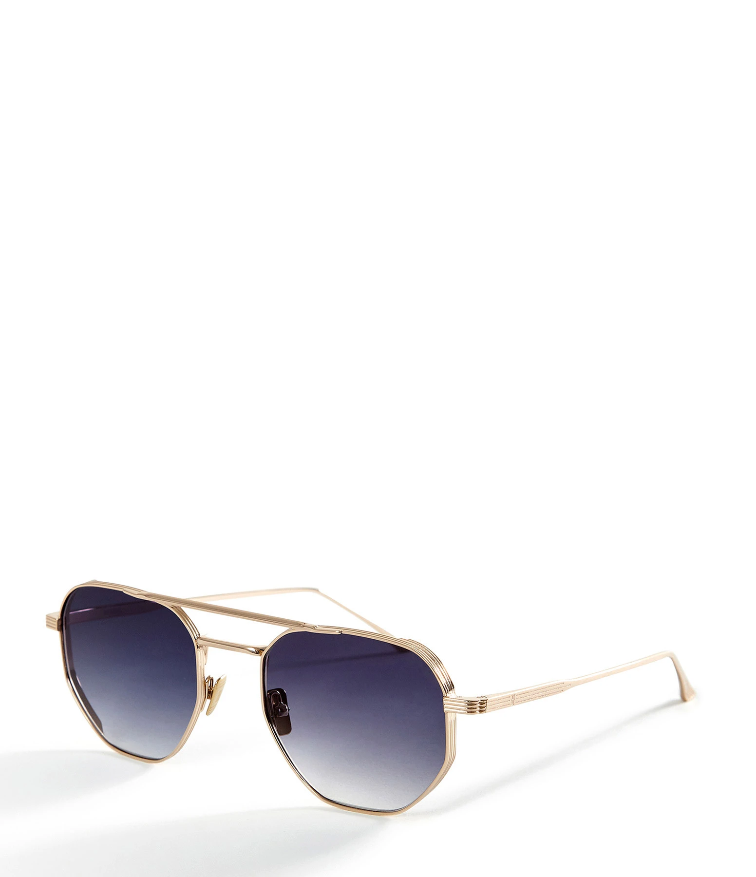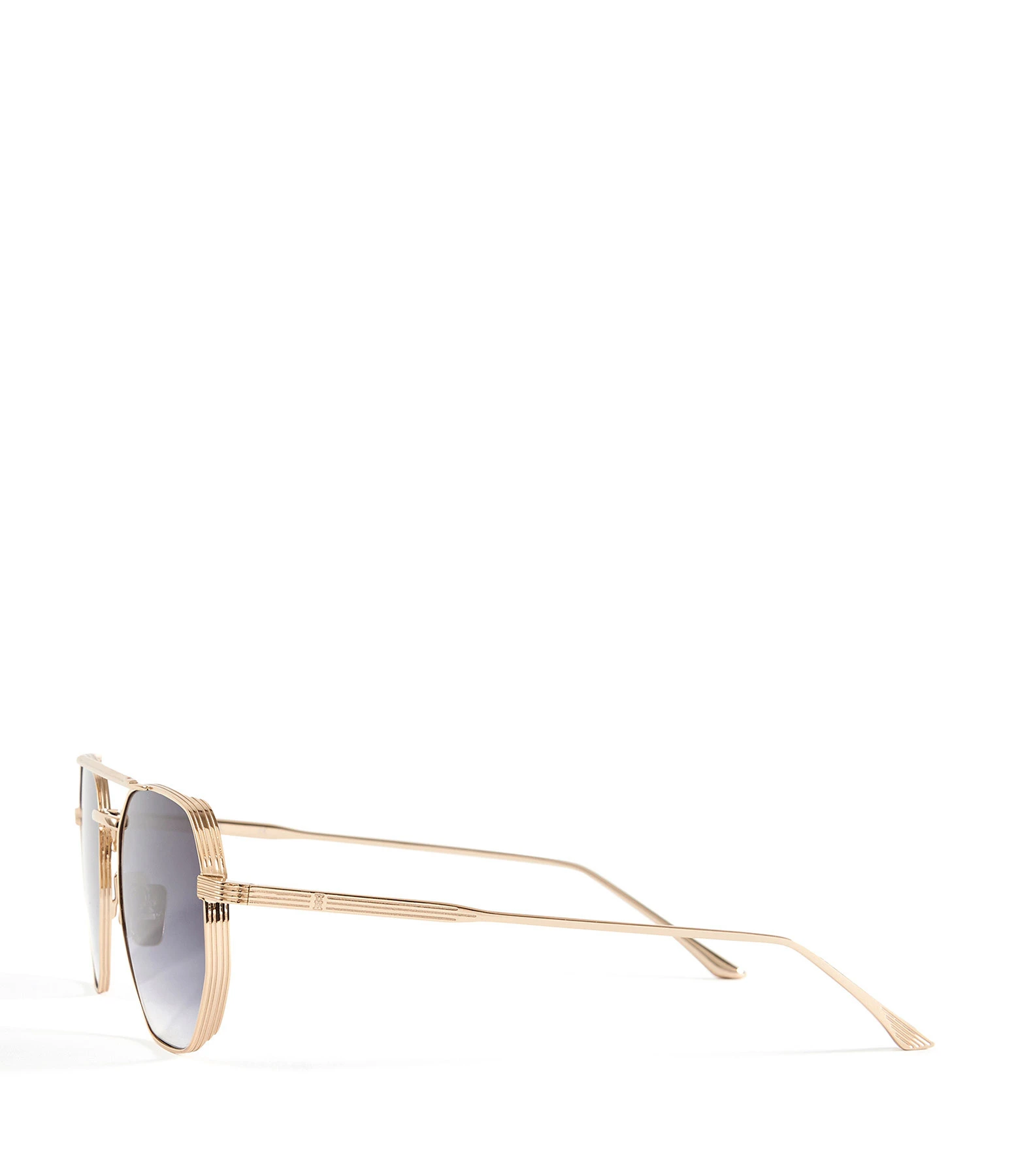 Lunettes de soleil dorées pour femme. Monture pilote à double pont avec une sur épaisseur, striées sur les bords extérieurs. Branches métalliques avec détails striés. Plaquettes titanium. Verres fumés noirs.