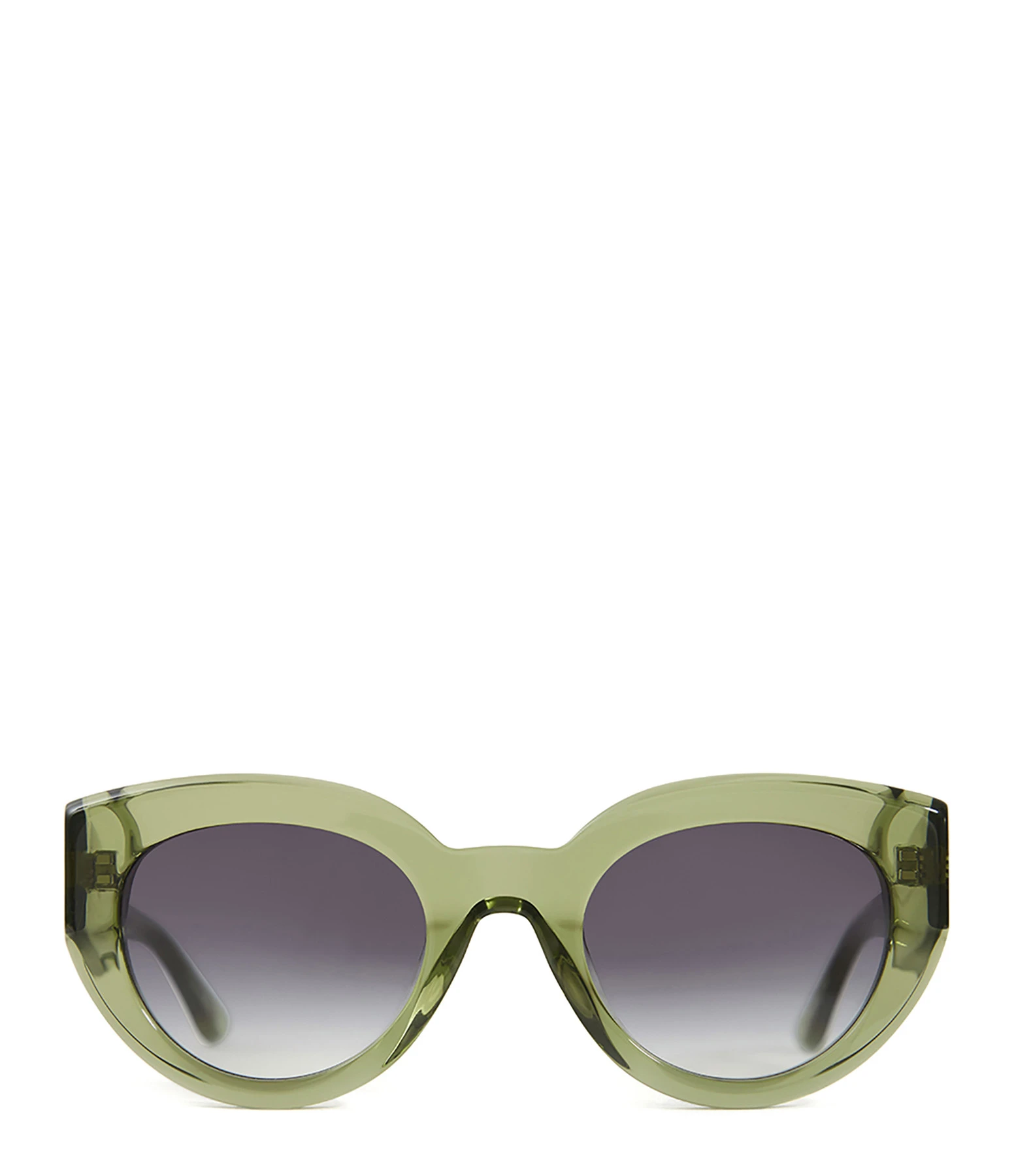 Lunettes de soleil vertes transparentes pour femme. Bords et branches larges, charnière rivetée 3 points. Verres fumés bleus gris.