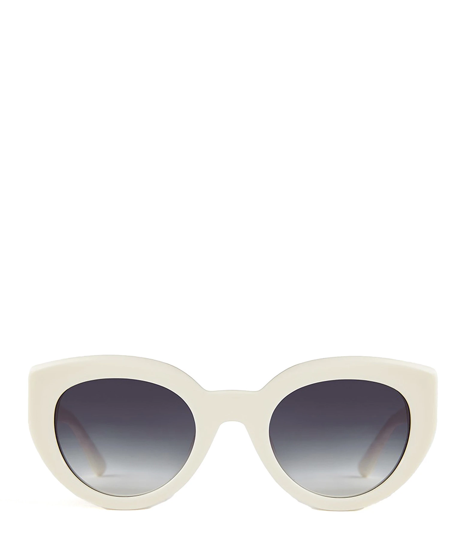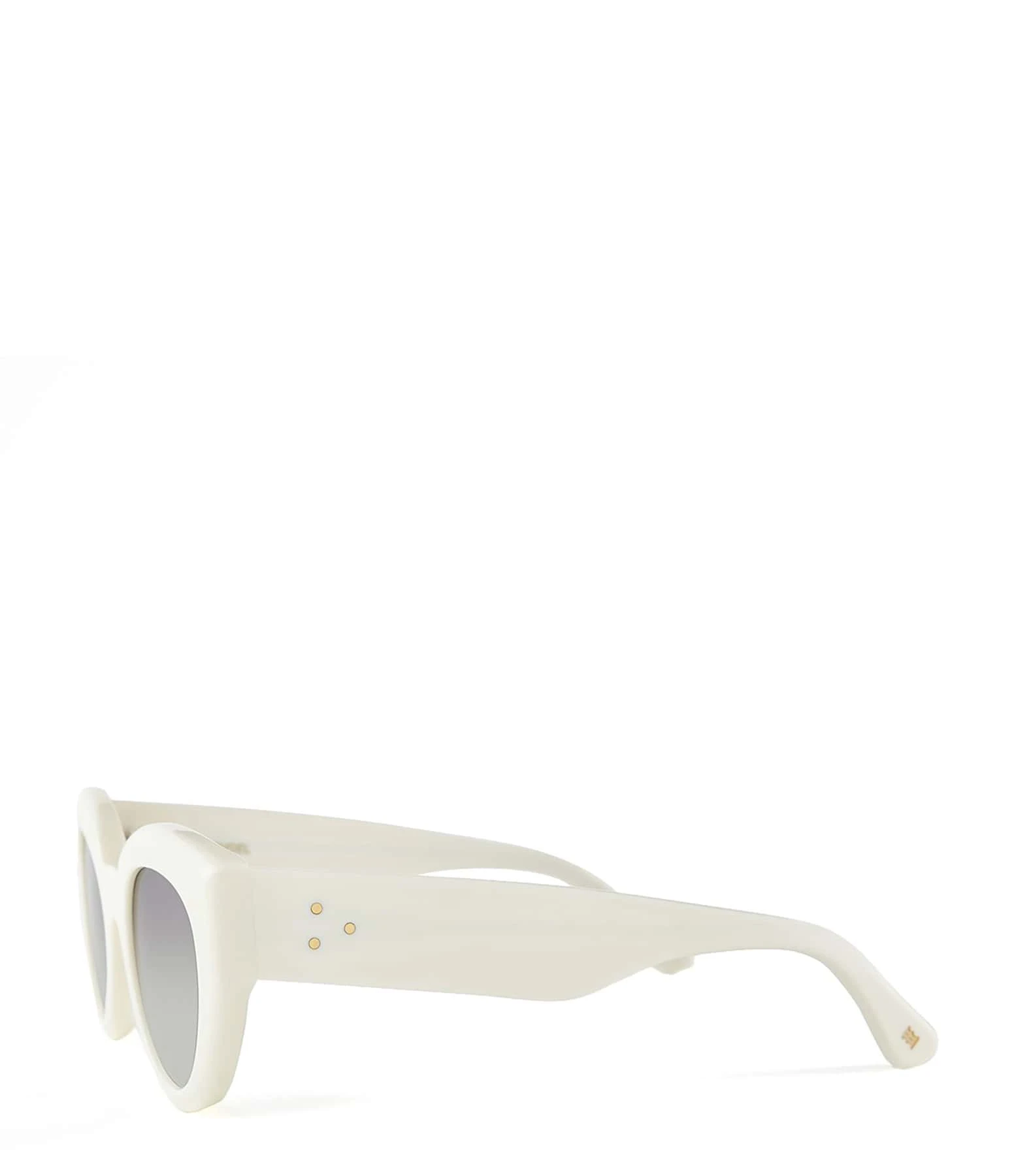 Lunettes de soleil blanches pour femme. Bords et branches larges, charnière rivetée 3 points. Verres fumés bleus gris.