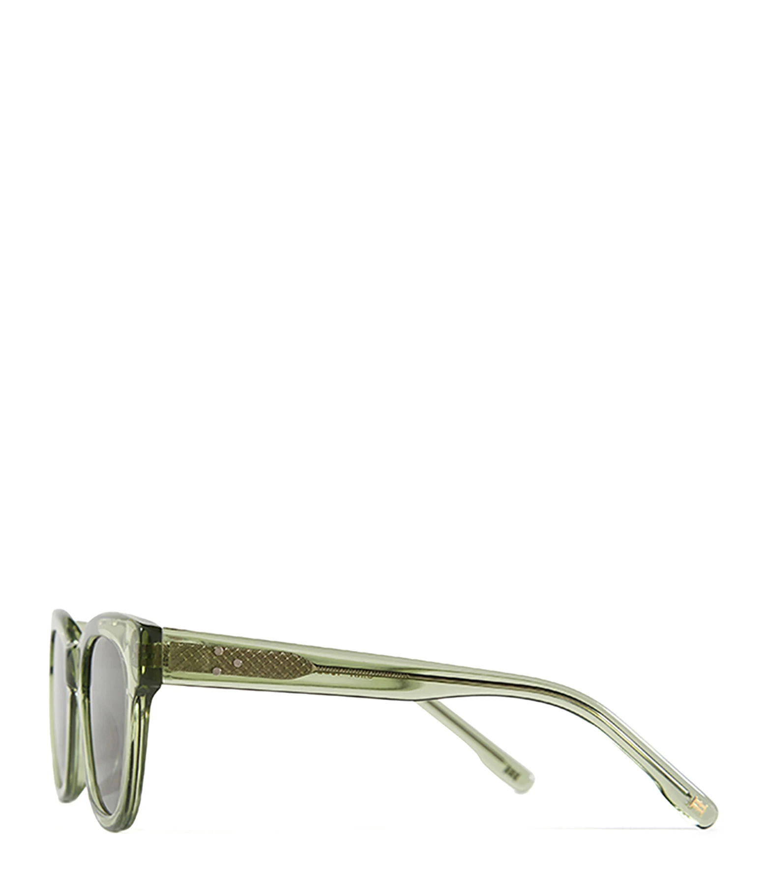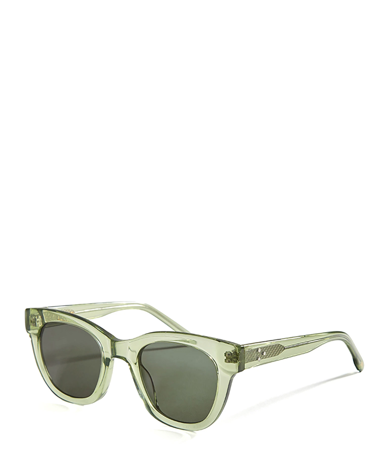 Lunettes de soleil vertes transparentes pour femme. Bords et branches fines. Monture papillonnante. Verres fumés verts.