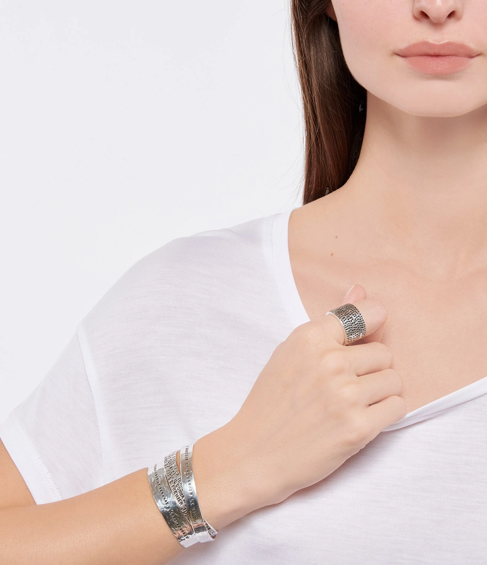 Bracelet jonc en argent avec gravure “Au commencement Dieu créa le ciel et la terre. Il dit : Que la lumière soit faite. Il sépara la lumière d’avec les ténèbres. Il donna à la lumière la nom de jour et aux ténèbres le nom de la nuit. Ainsi se fit le premier jour”.