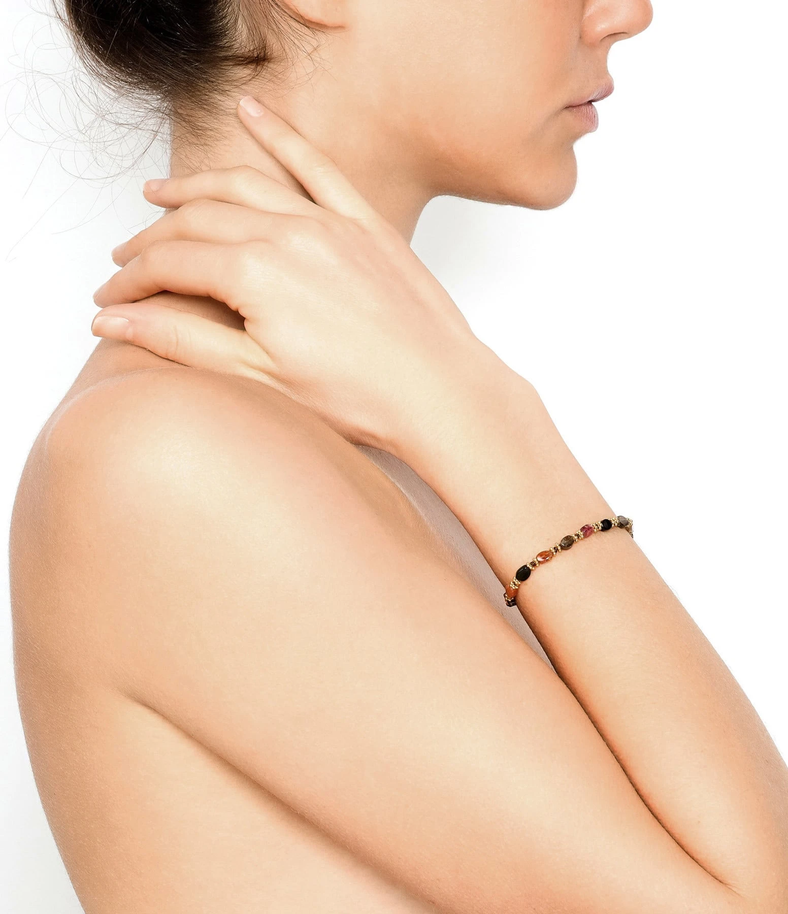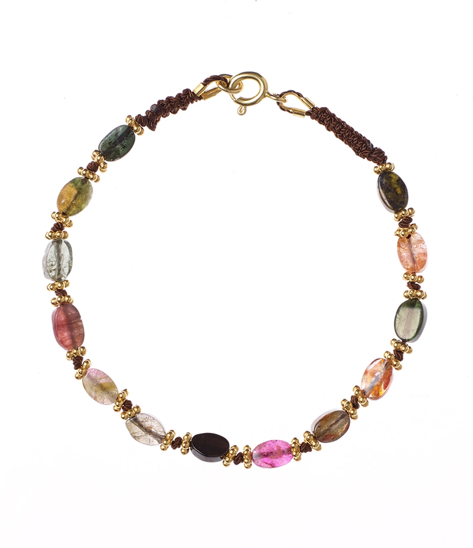 Bracelet en cordon orné de perles de Tourmaline multicolores et perles plaquées or. Fermoir classique à ressort.