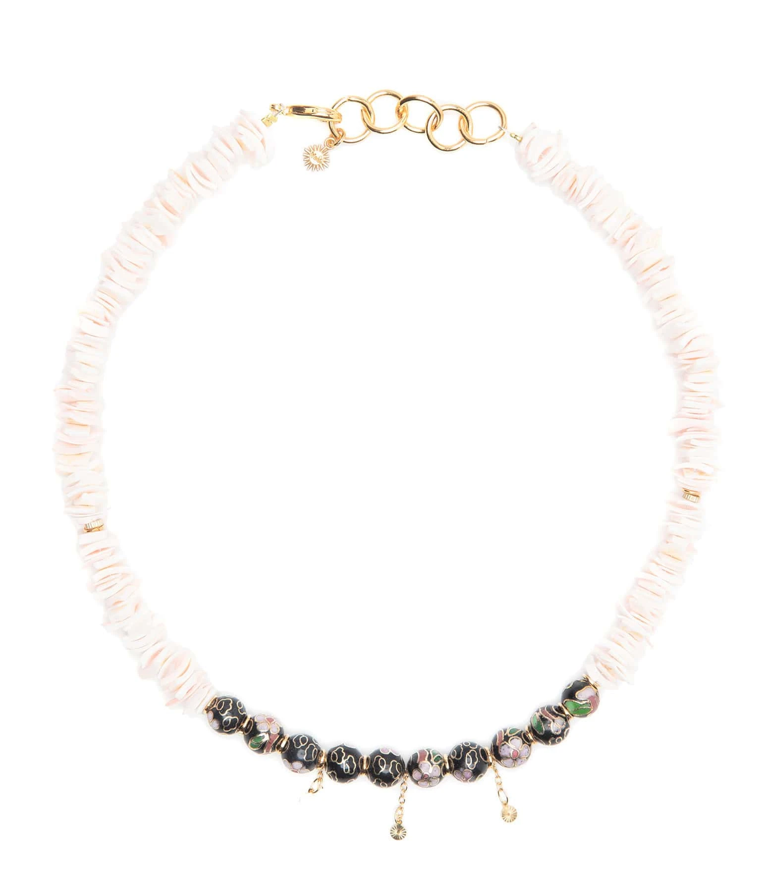 Collier en coquillage rose avec dix perles en verre noir à motif coloré sur chaßne en argent doré. Fermoir classique à ressorts.