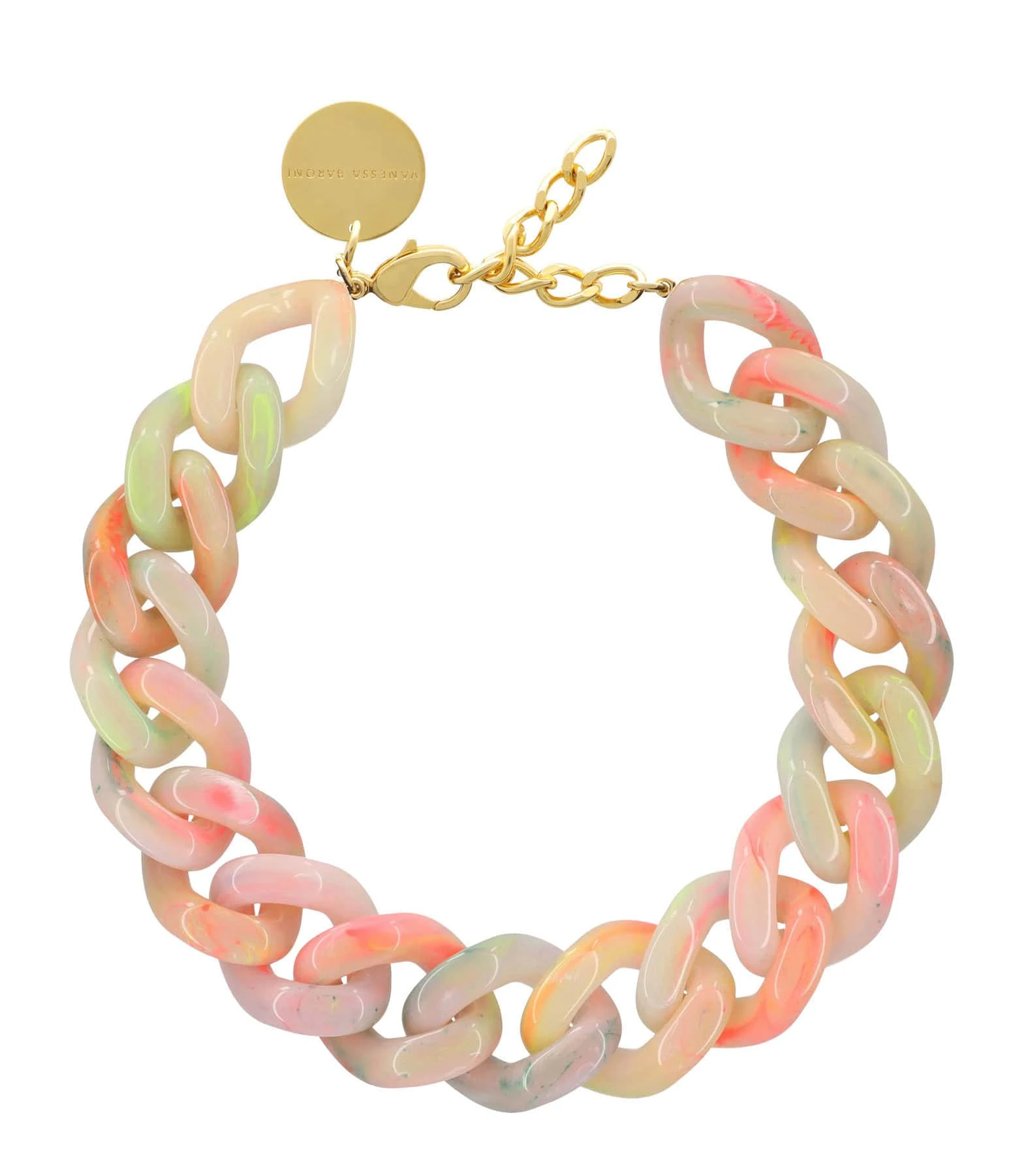 Collier jaune à gros maillons multicolores. Fermoir classique à ressort.